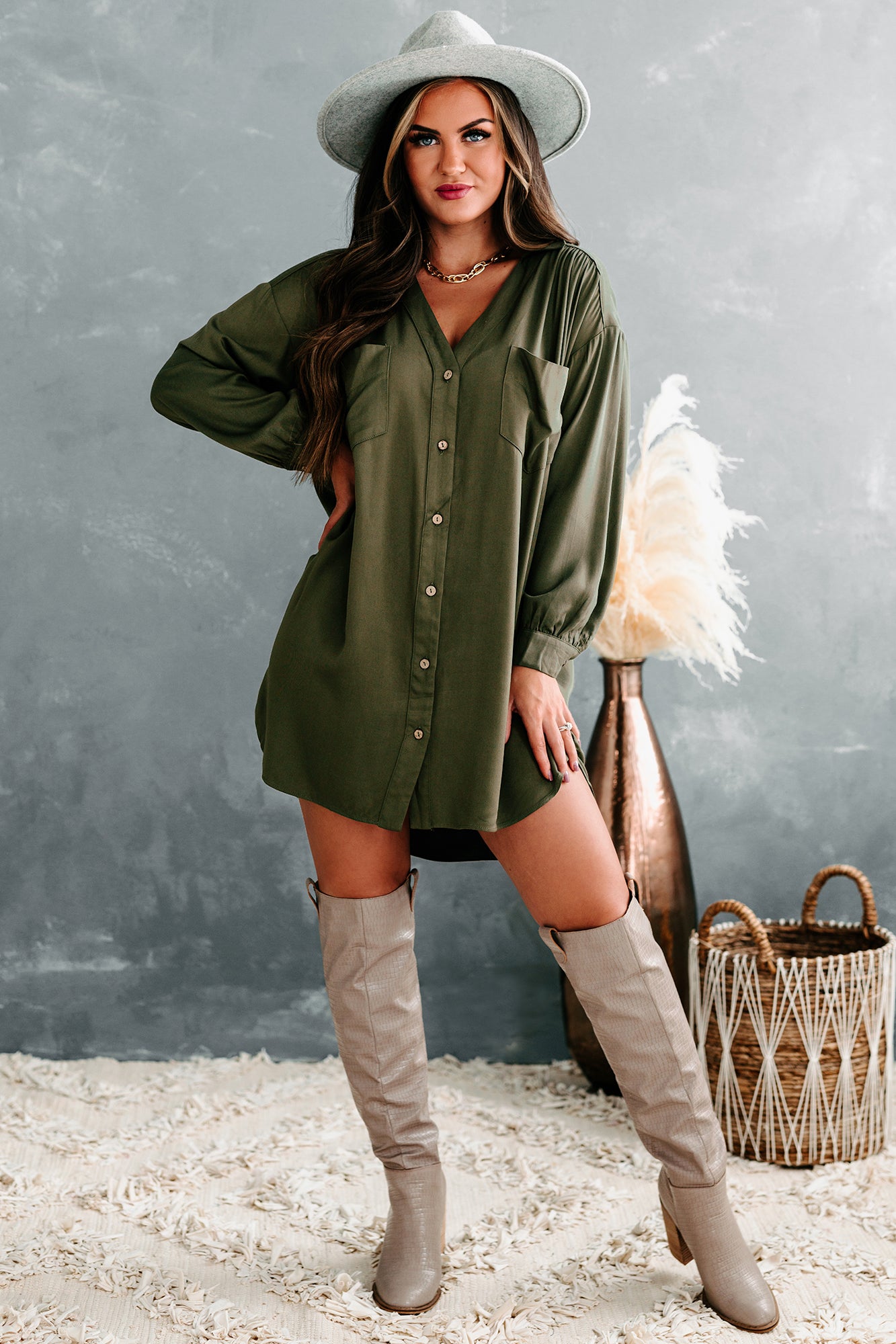 Lake Lover Long Sleeve Button Down Tunic Dress (Olive)