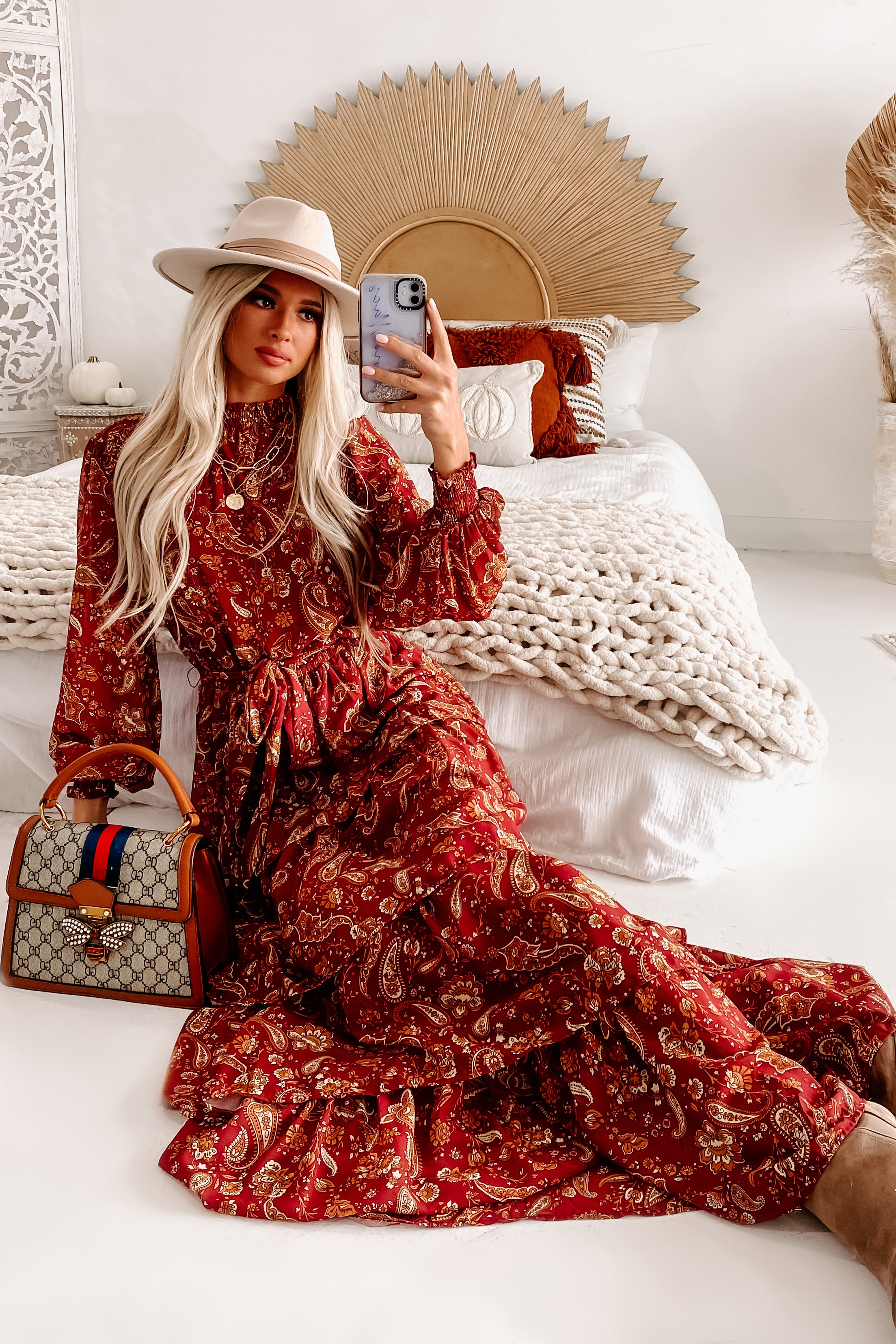 Always Memorable Tiered Printed Maxi Dress (Burgundy)