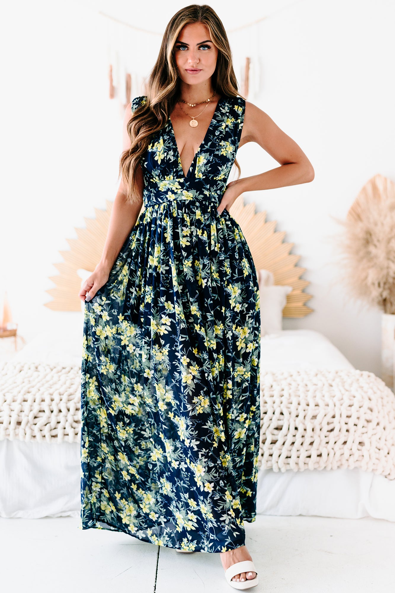 Magical Evening Floral V-Neck Maxi Dress (Navy)