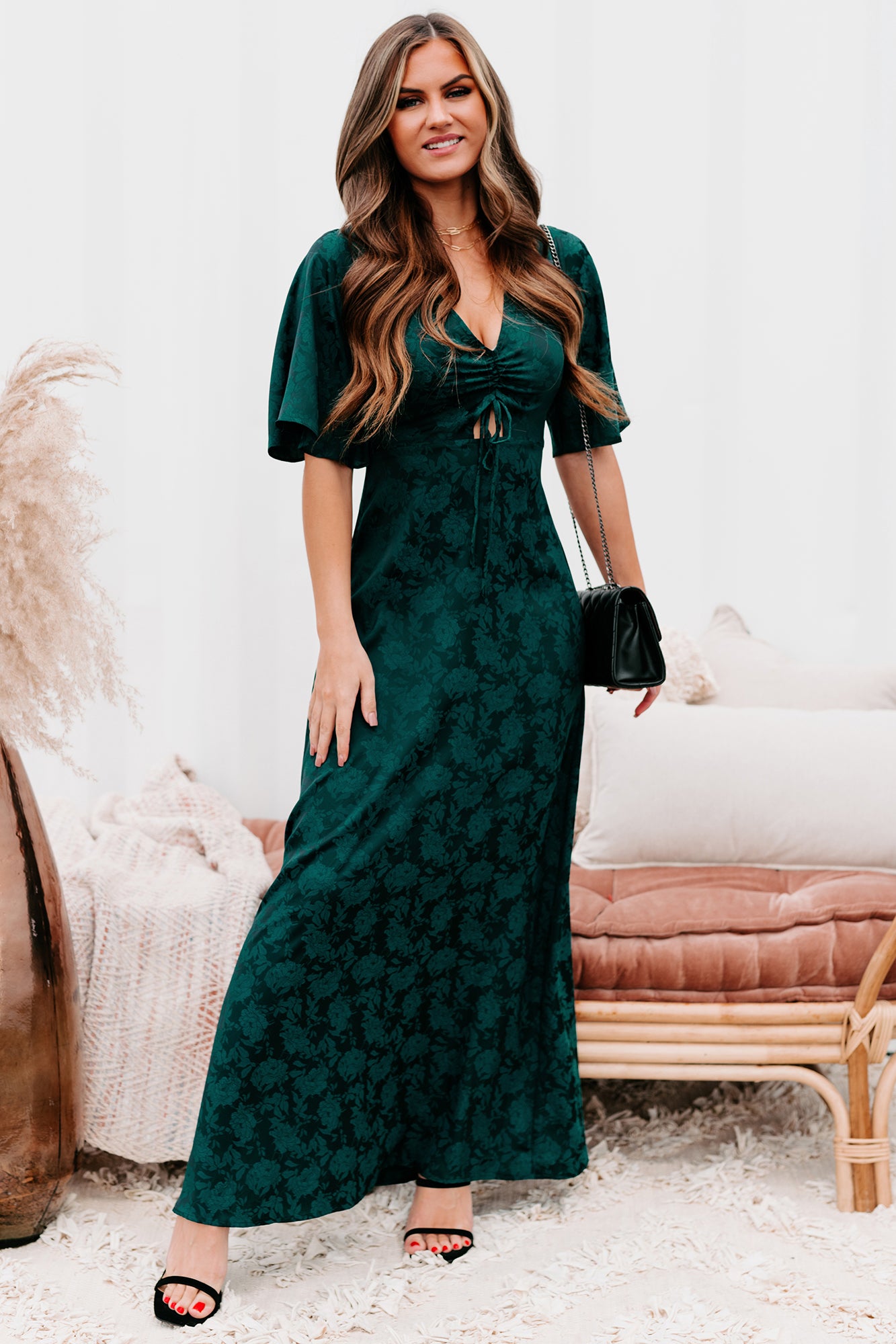 Always Celebrating Ruched Front Floral Maxi Dress (Dark Green)