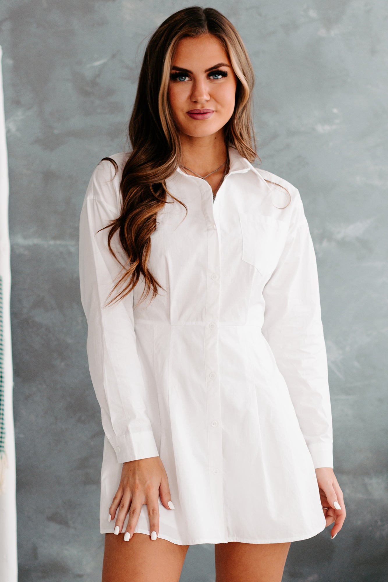 Feel Like A Boss Babe In This White Button-Front. Pleated Shirt Dress!