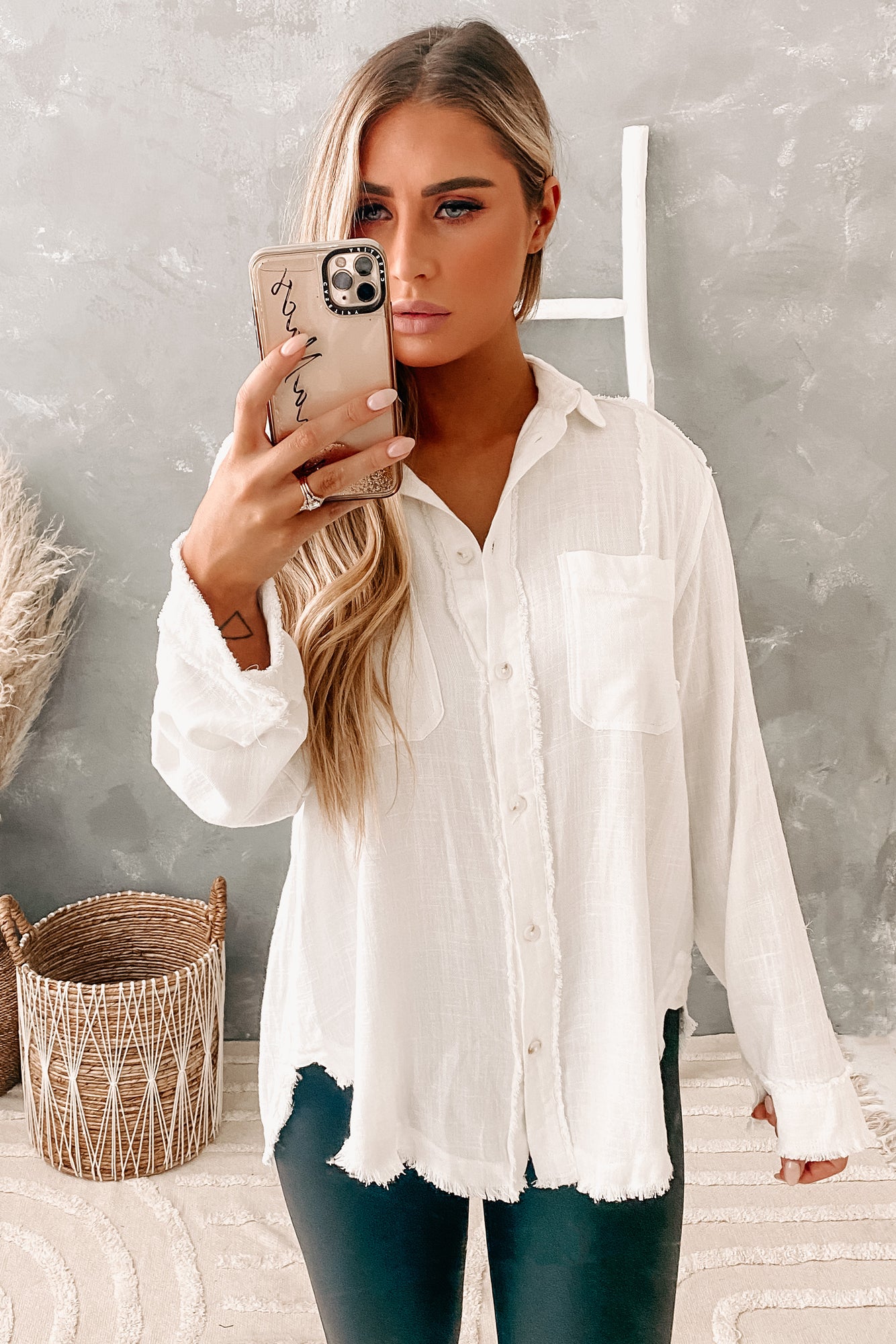 Add A Little Edge To Your Fall Closet With This Raw Trim Hem Button Down Tunic Top!