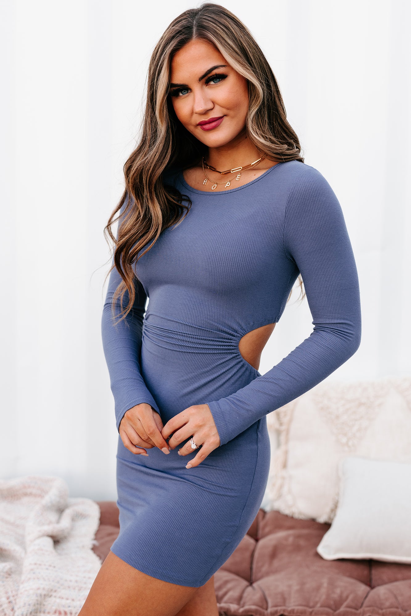 Get Ready To Party With This Eggplant Blue. Ribbed. Long Sleeved. Cut-Out Mini Dress! This Dress May Be Simple But It's Oh So Flattering!