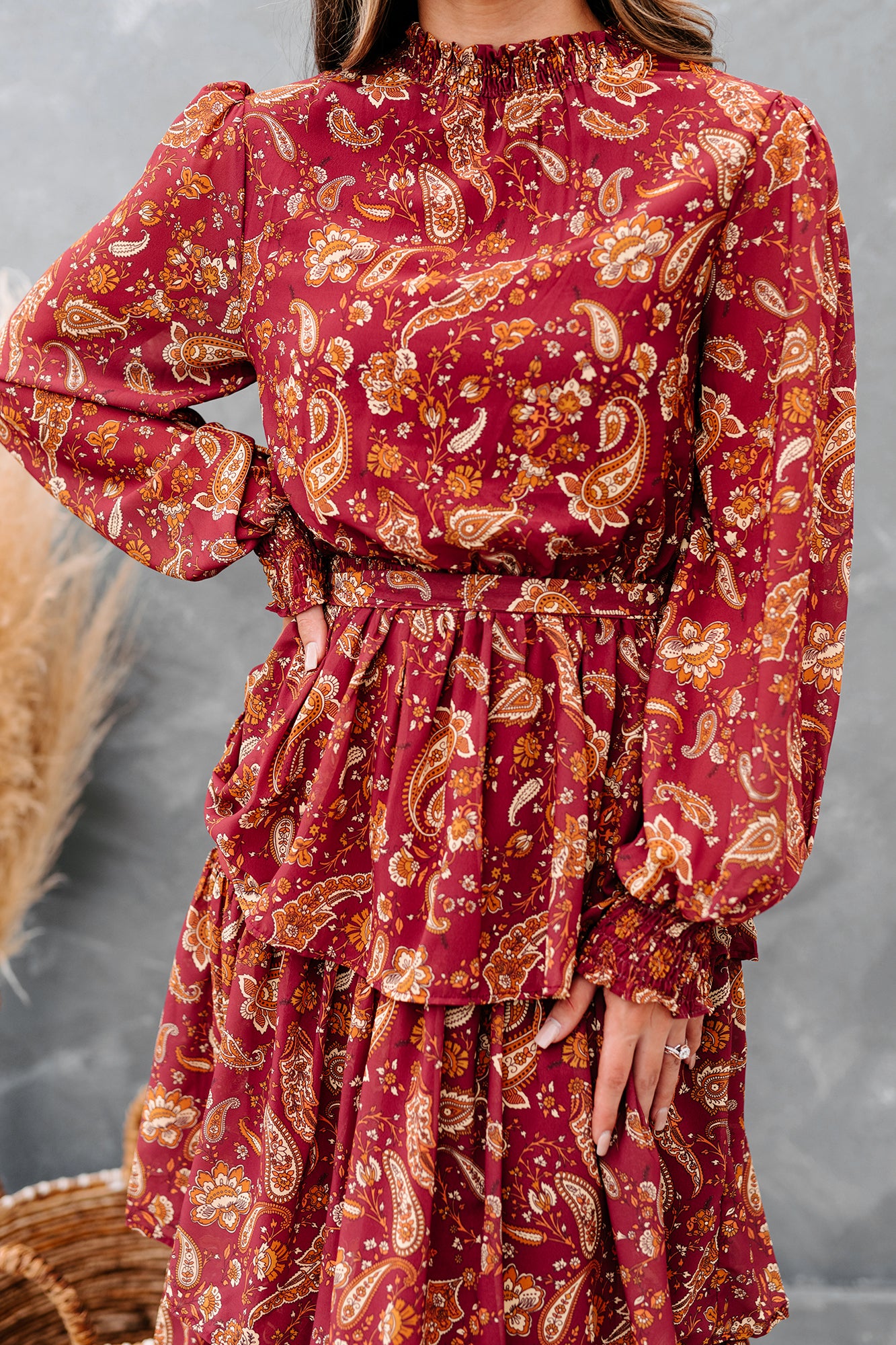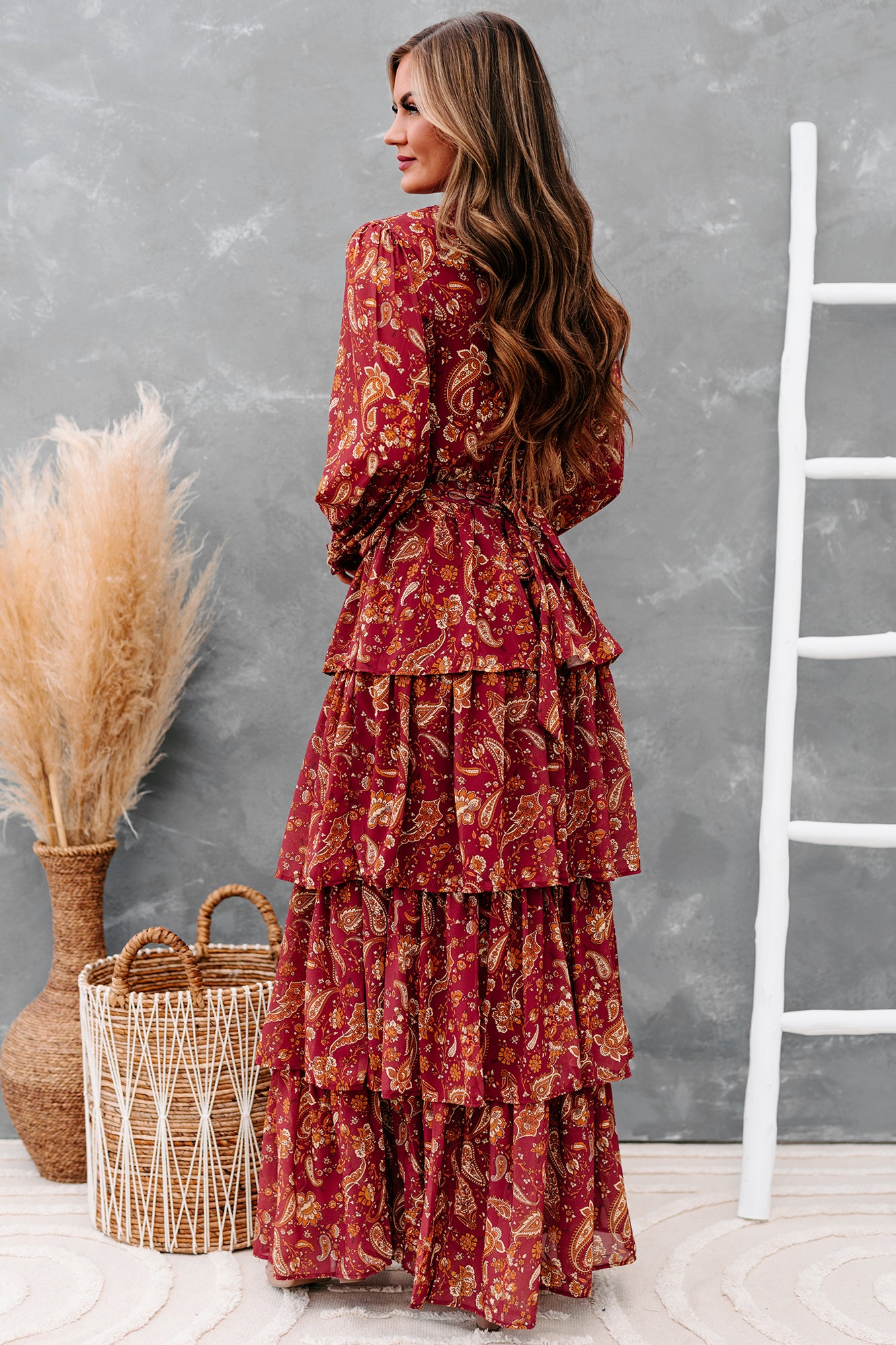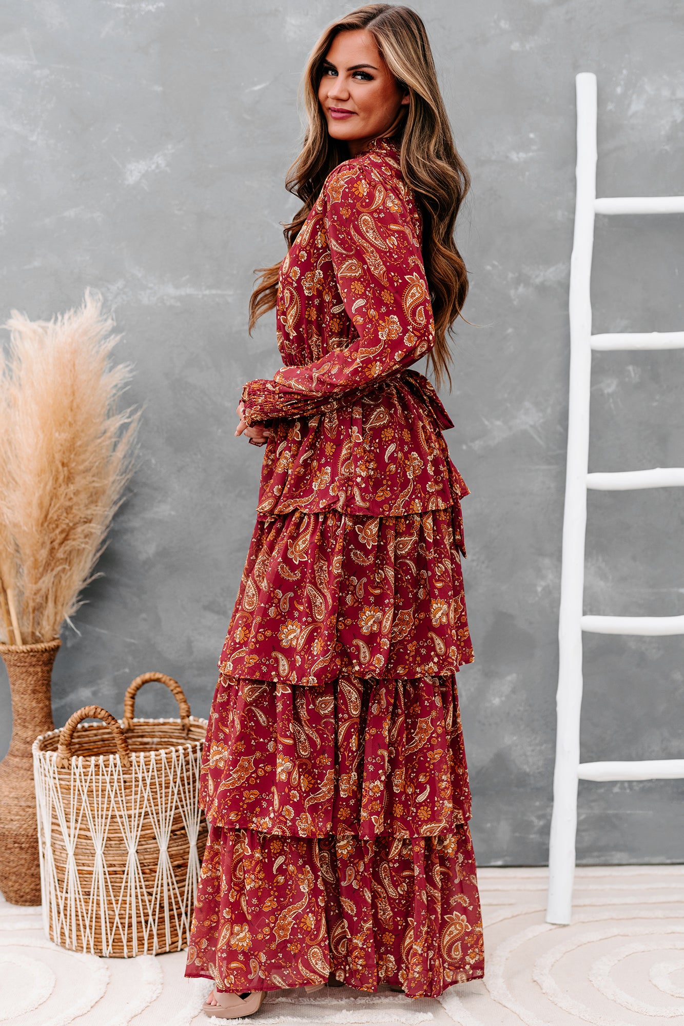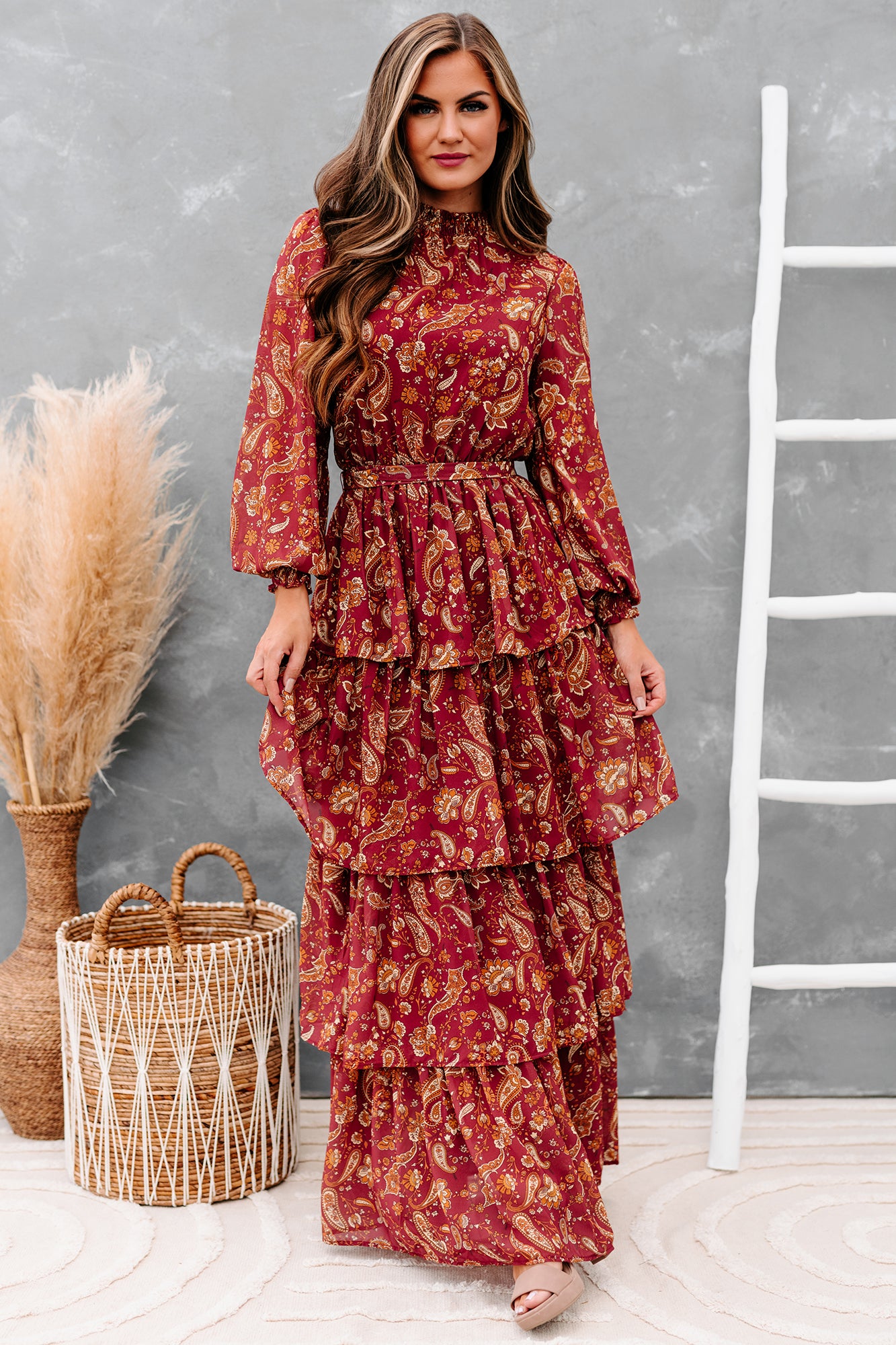 Be Memorable In This Burgundy. Paisley Printed. Long Sleeved. Tiered Maxi Dress!