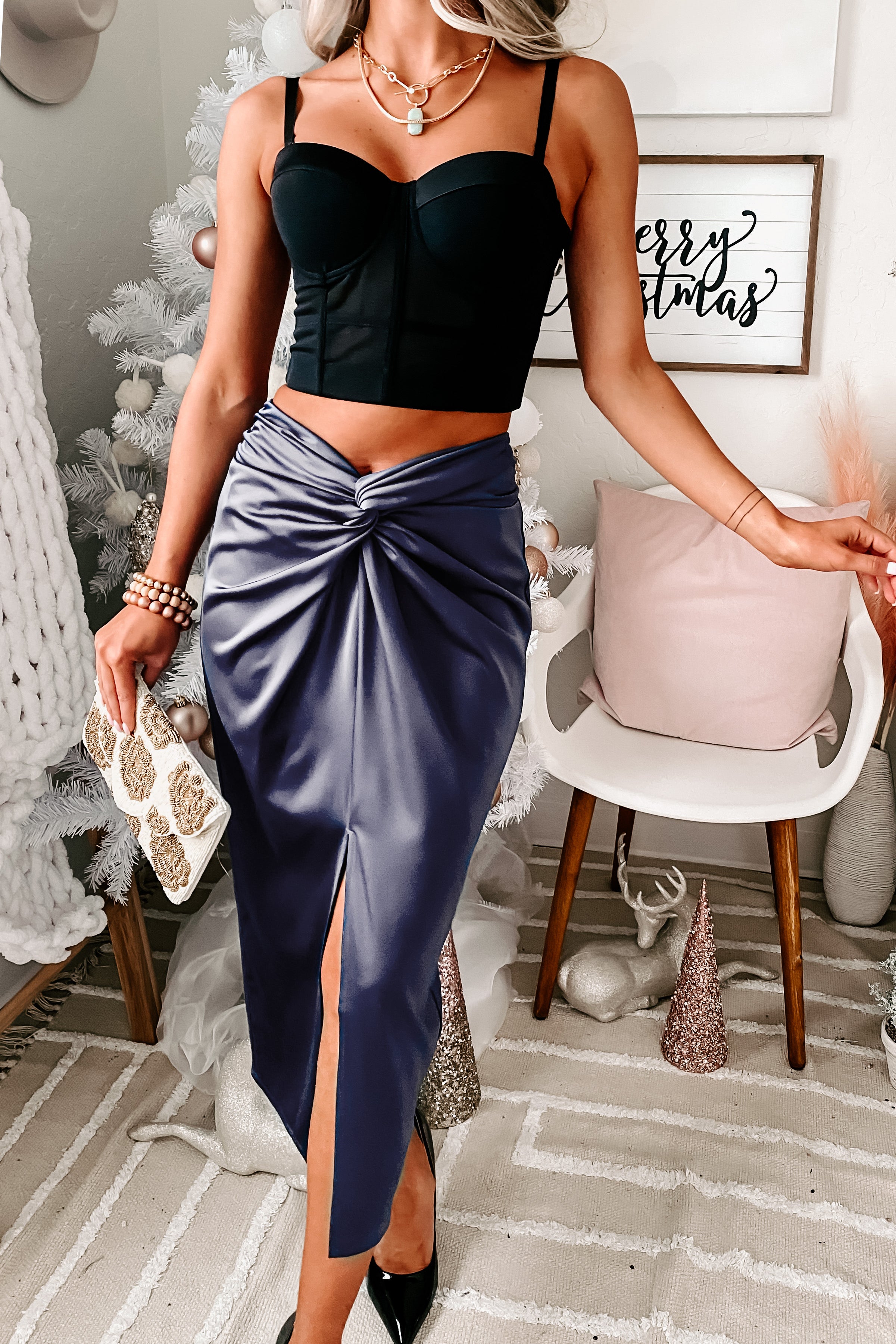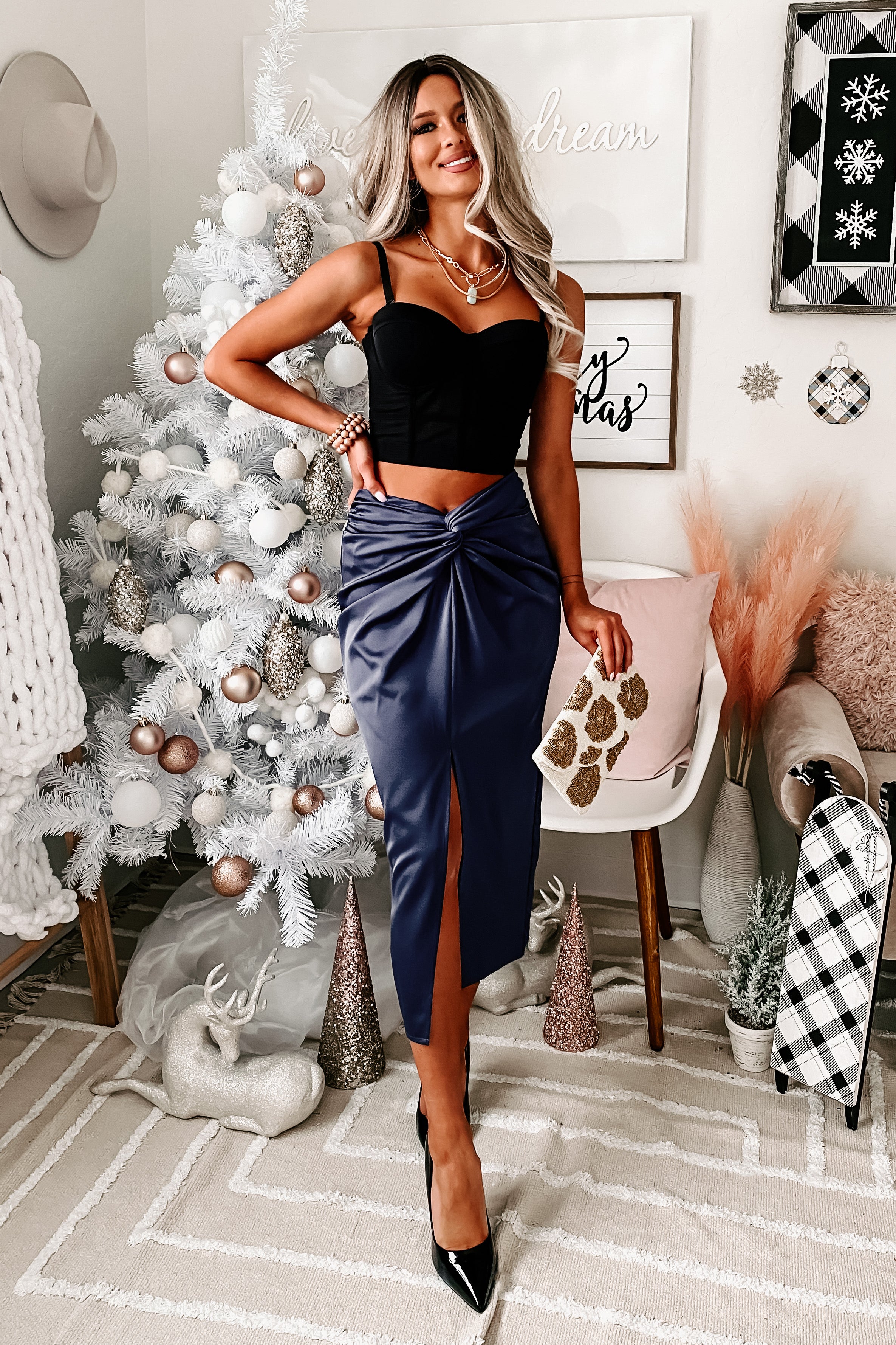 You'll Look Great In This Navy. Twist Knot Midi Skirt!