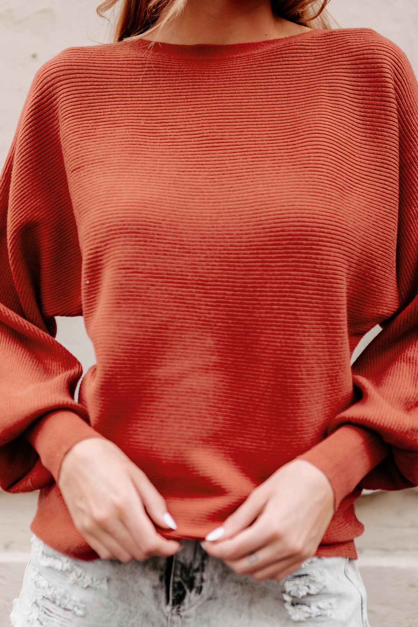 Don't Miss Out On This Amazing. Light Rust. Ribbed. Boatneck. Balloon Sleeved Sweater! It's A Must-Have Item!