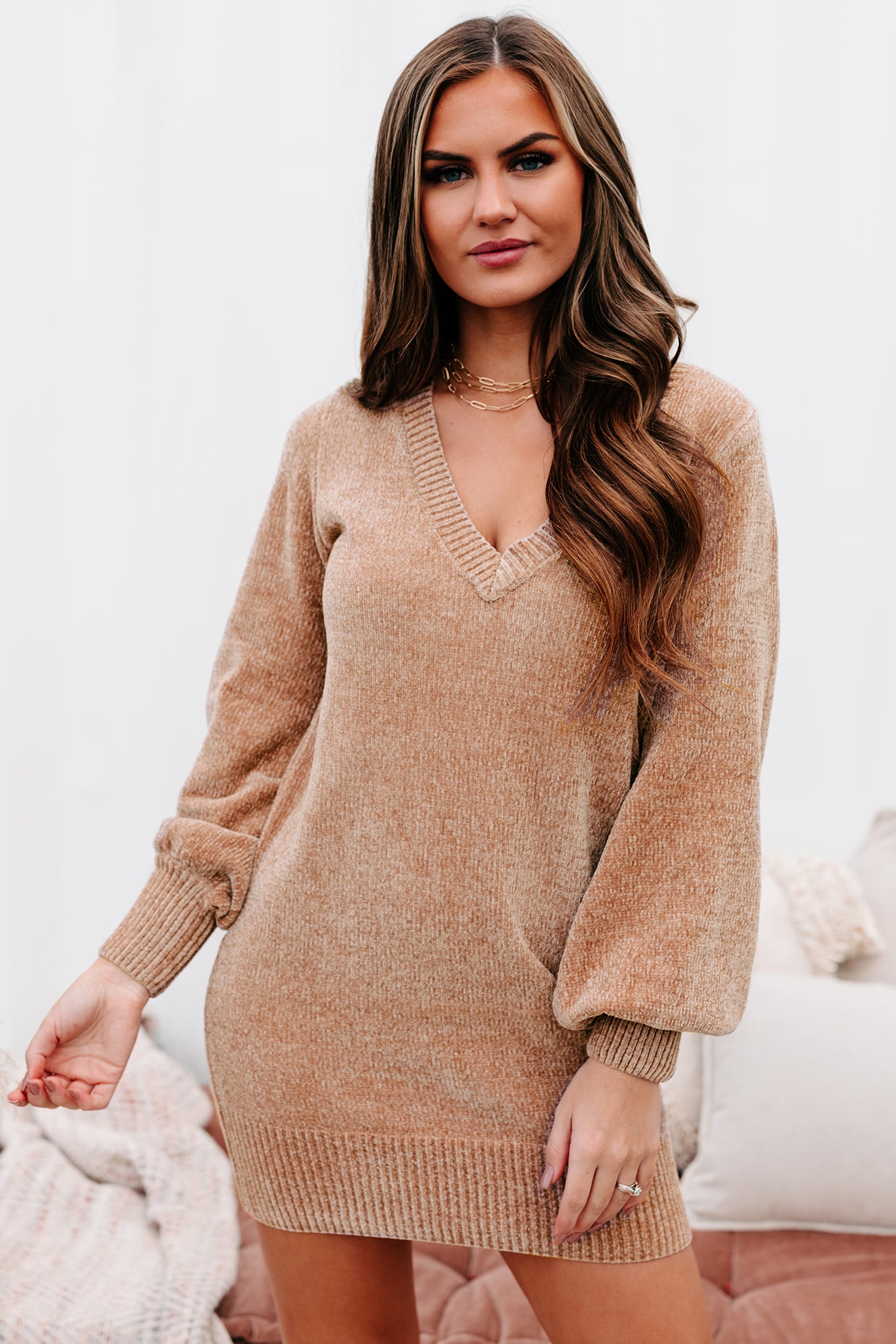 You're Missing Out If You Don't Snag This Mocha Brown. V-Neck. Chenille Knit Sweater Dress! It's The Softest Thing Ever!