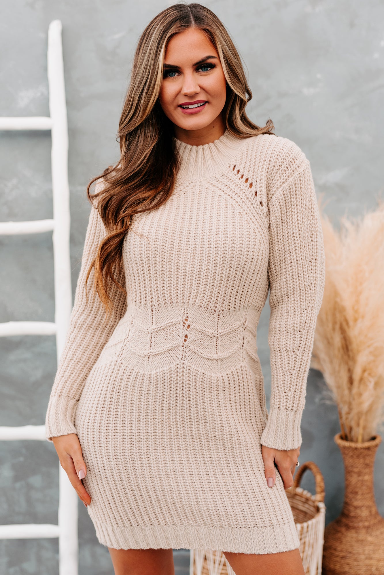 This Ecru Sweater Dress Is Just A Step Above The Basic Sweater Dress With The Chevron Waist Detail!