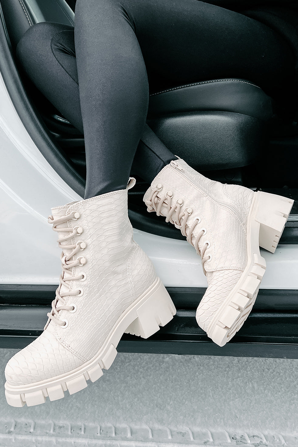Cold Blooded Textured Snake Pattern Combat Booties (Ivory)