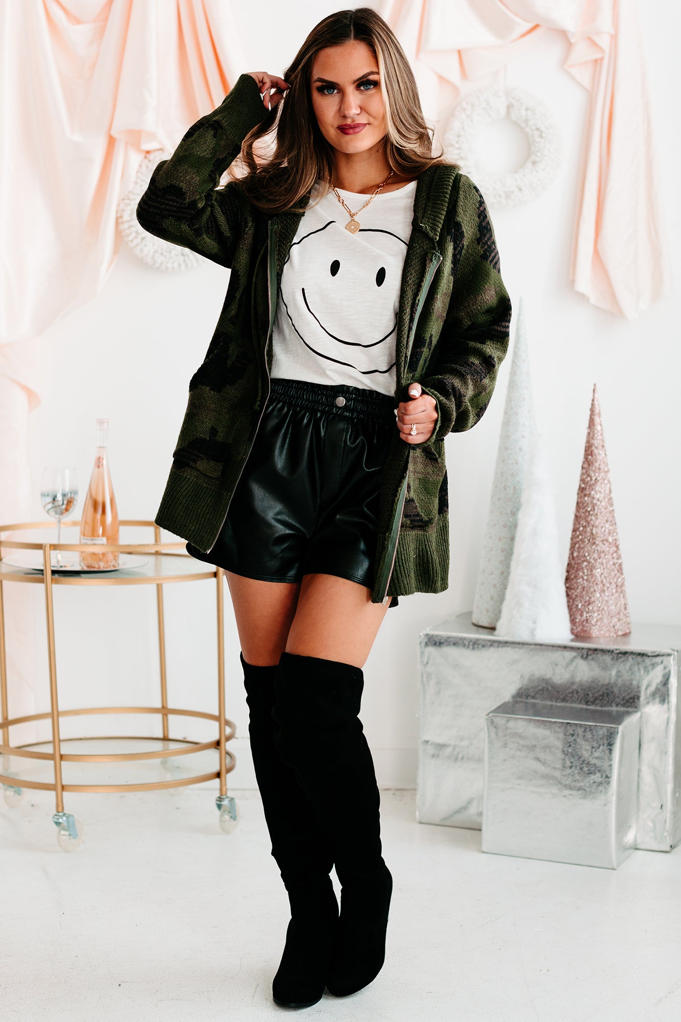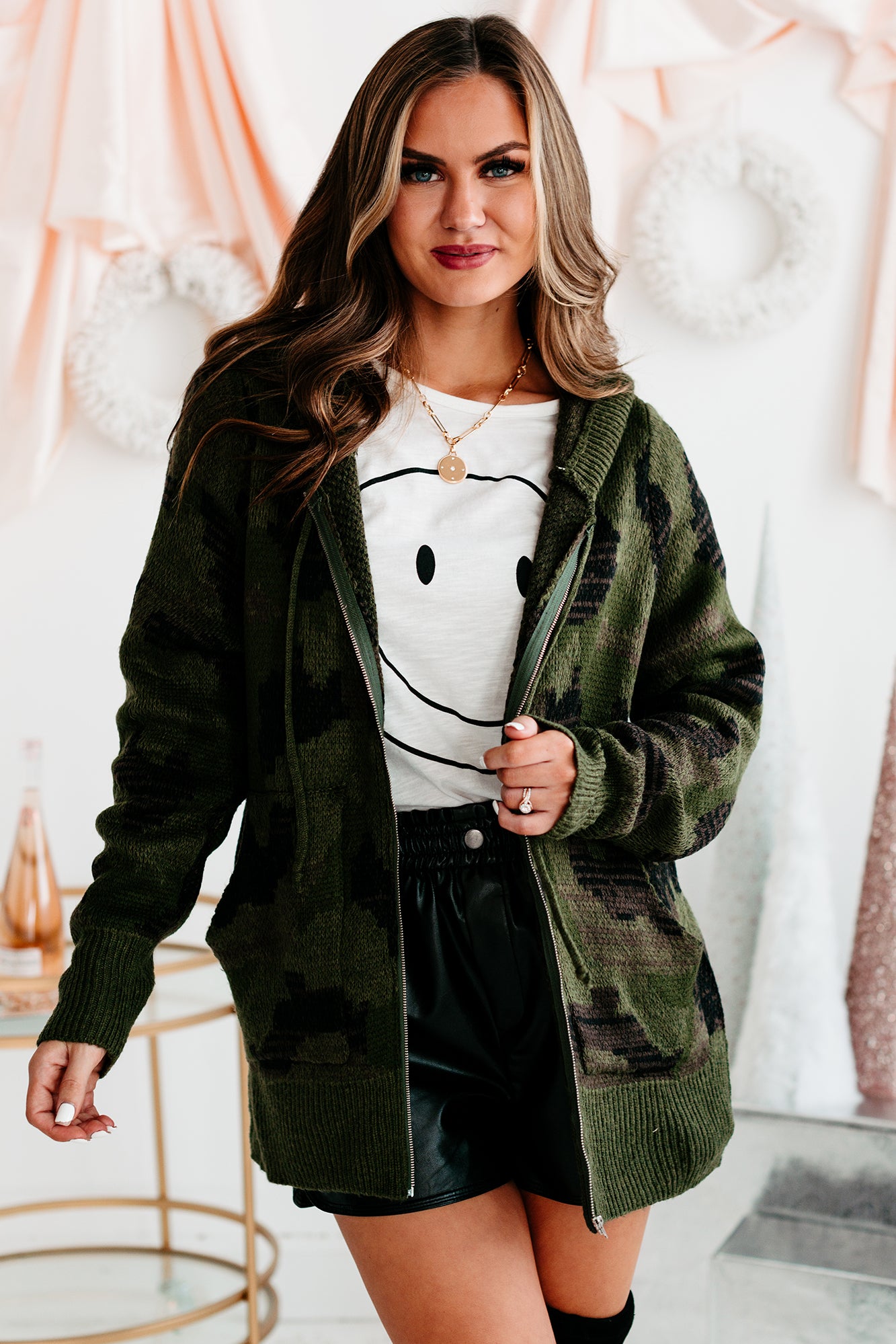 We Can Totally See You Snuggling Up On The Couch In This Army Green. Camo Knit. Zipper Hoodie!