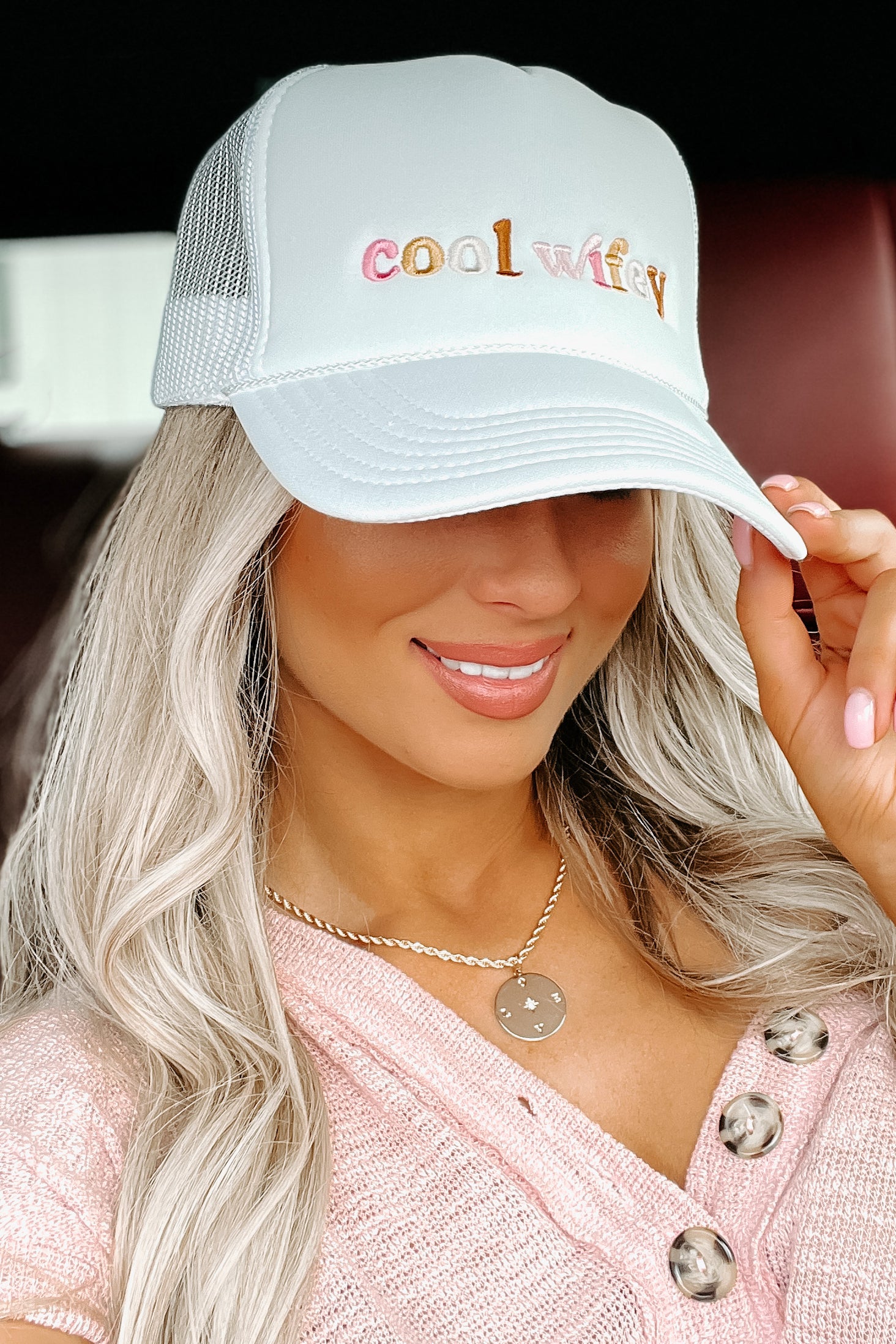 Be The Cool Wife We All Know You Are With This Embroidered. White Foam Trucker Hat!