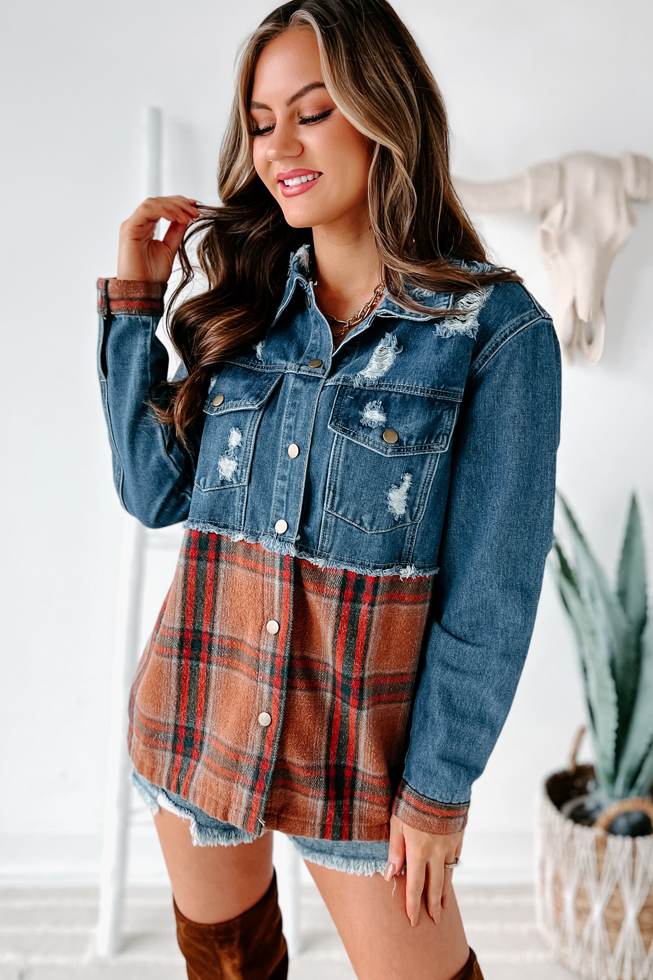 - Plaid Colorblock Denim Jacket