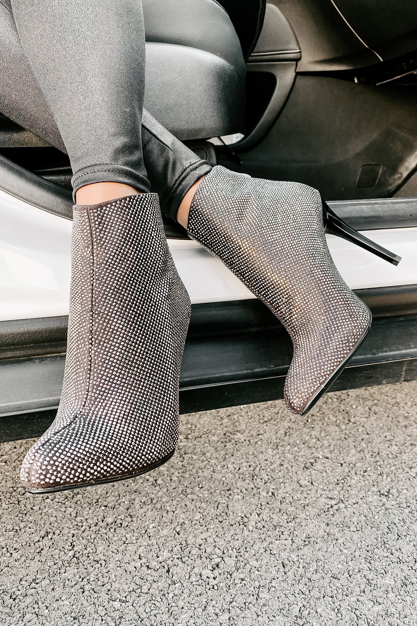 Feel Your Confidence Grow With Every Step In These Grey. Heeled. Rhinestone Studded Booties!