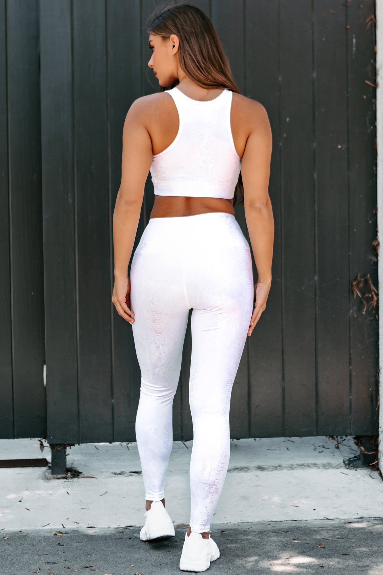 You Can Still Look Pretty While Working Out With This White. Iridescent. Printed Crop Top & Leggings Set!