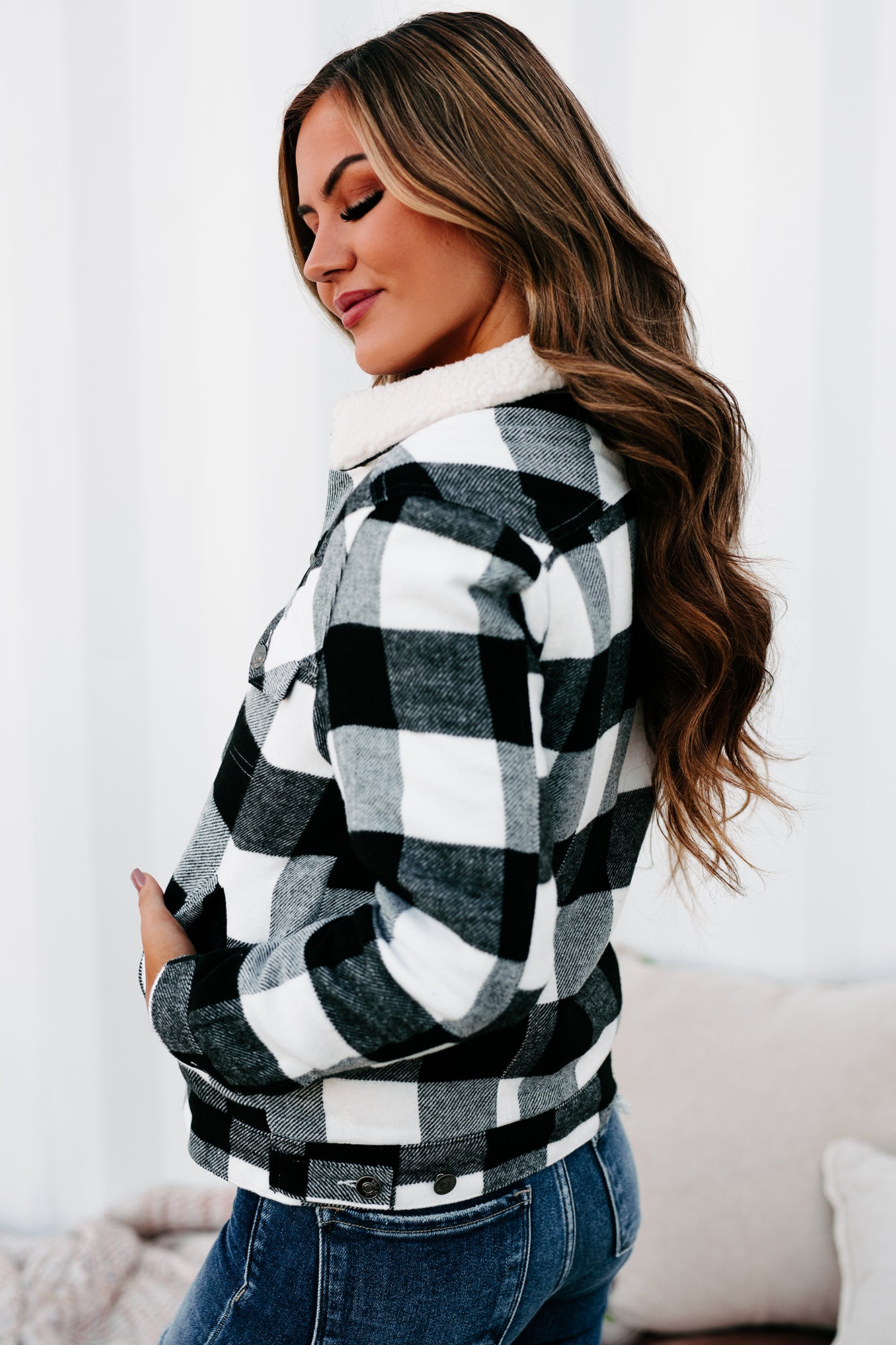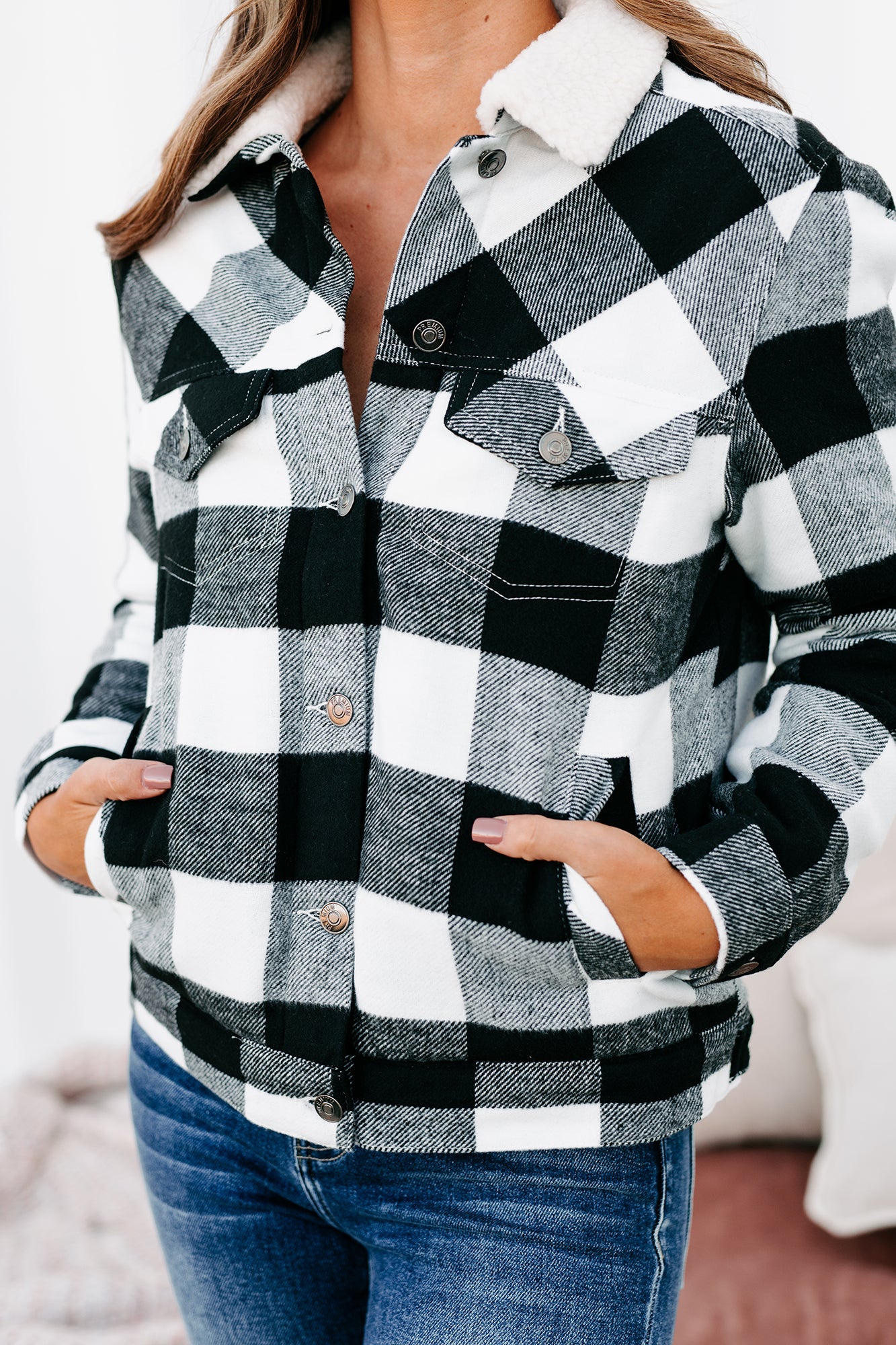 You Are Going To Absolutely Obsess Over This Black & White. Checkered Plaid Jacket! It Has That Trendy. Sherpa Lining!