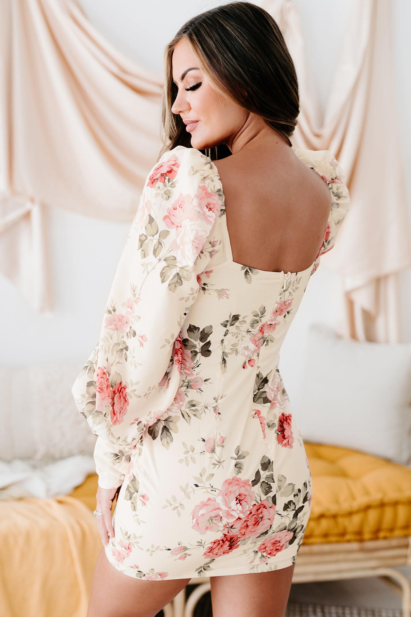 Turn Heads In This Ivory. Floral Print. Long Sleeved. Padded Bust. Fitted Mini Dress!