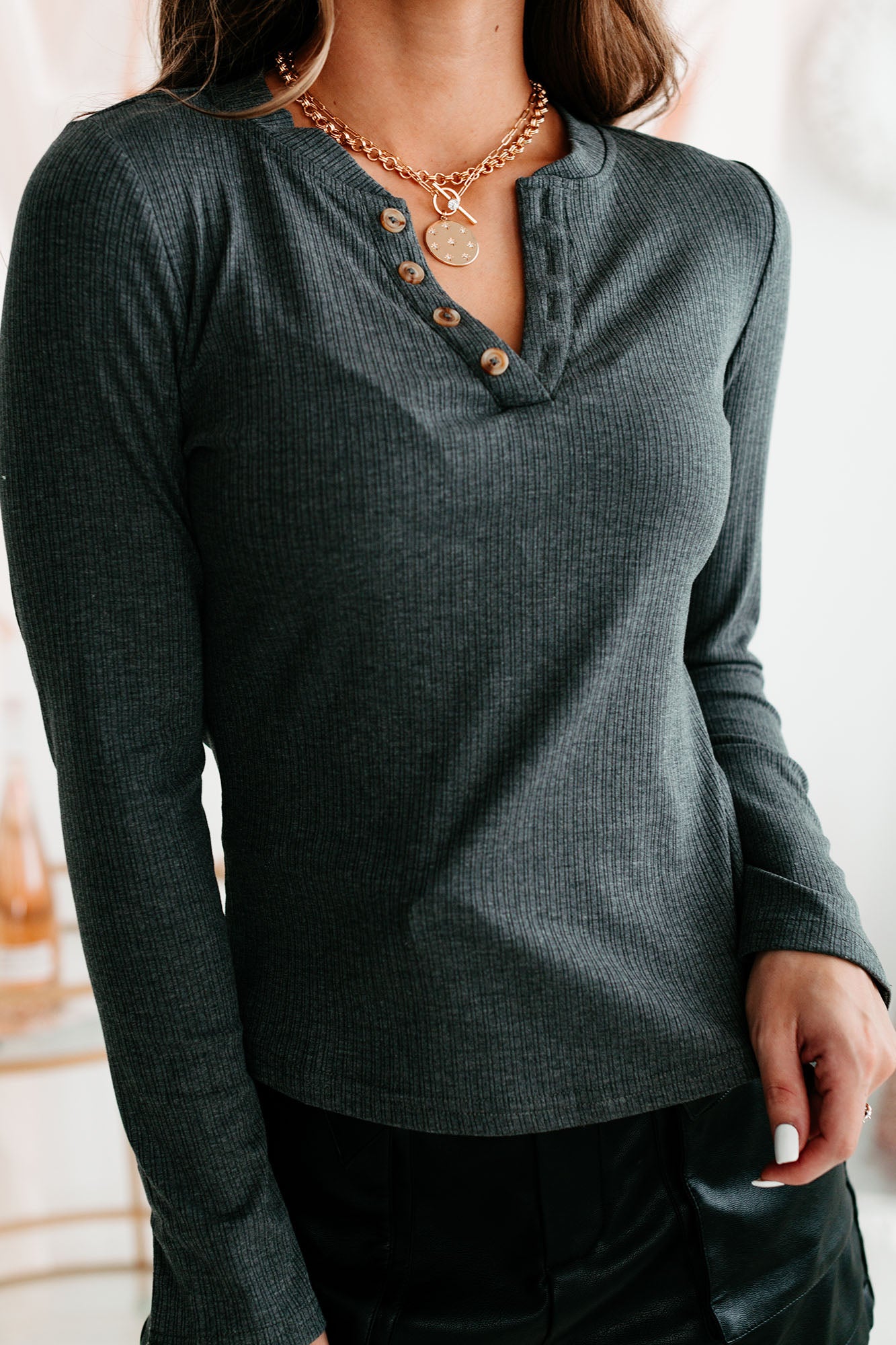 This Heathered Charcoal Button Detail Long Sleeve Top Is The Perfect Basic To Have In Your Closet!