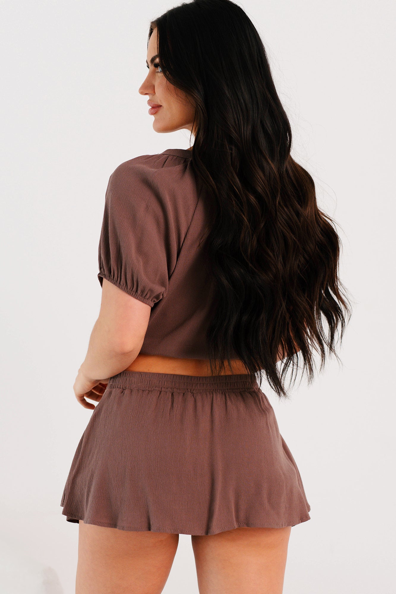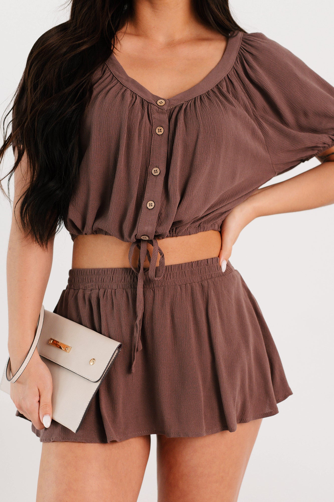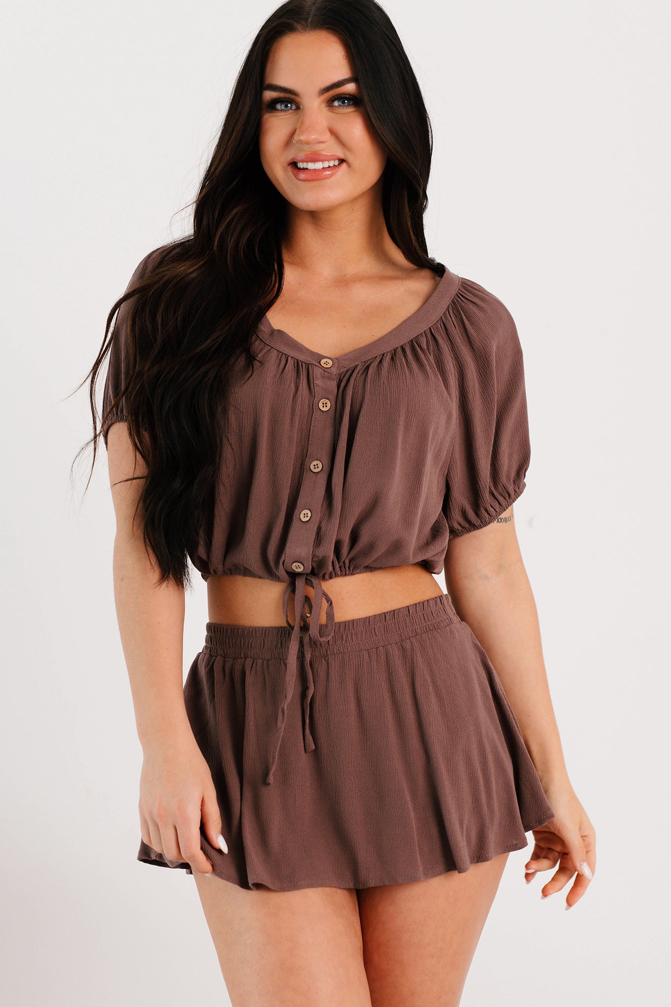 - Top: Scoop Neckline. Puff Short Sleeves. Button-Up Front. Drawstring Hem. Slightly Cropped Length