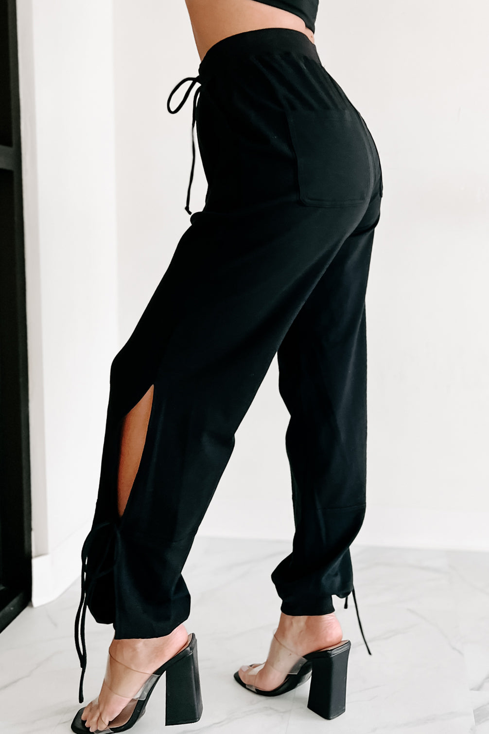 - Bottoms: Drawstring Elastic Waistband. Side Pockets. Side Leg Slits With Tie Detail. Back Pockets.