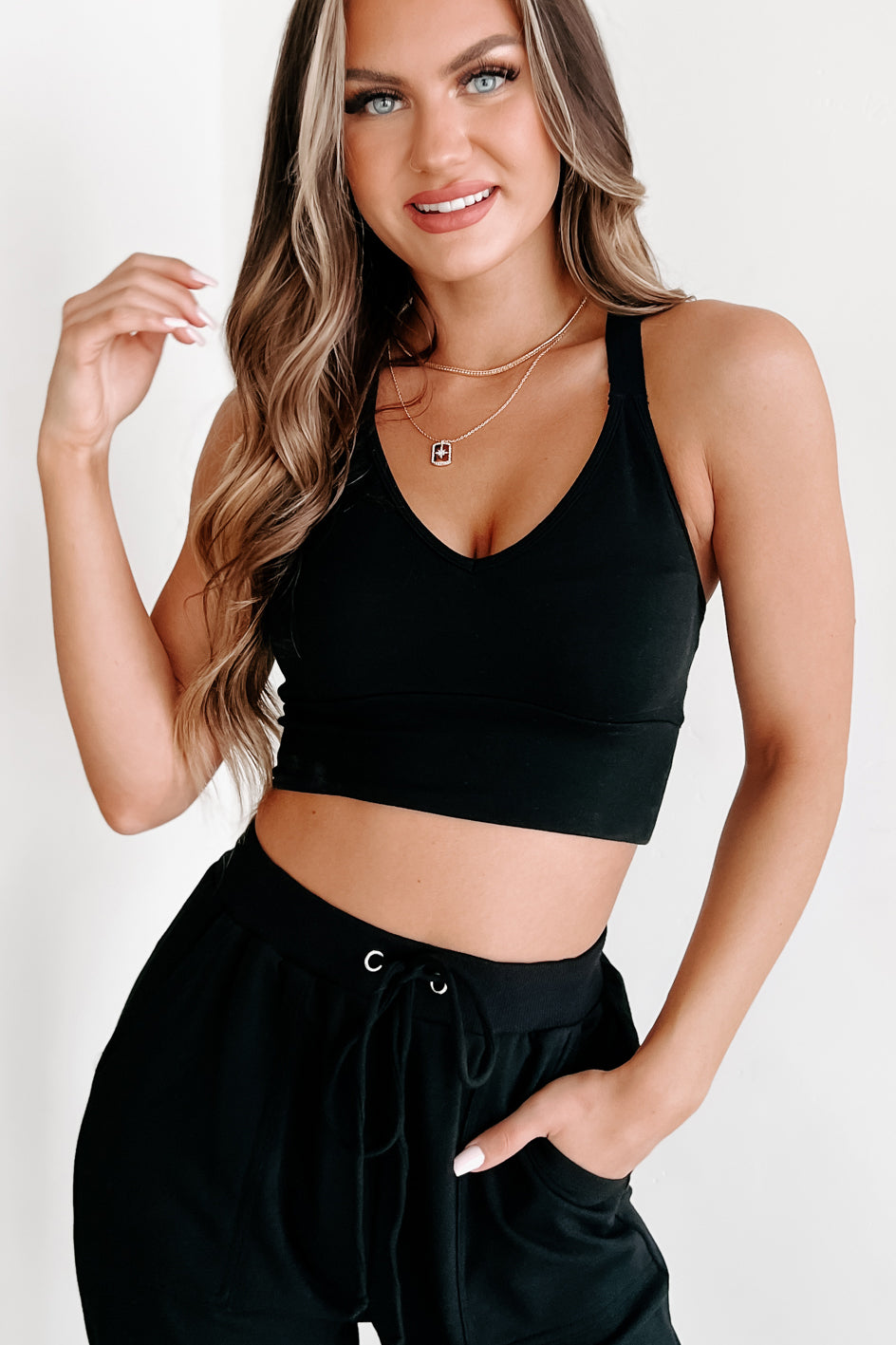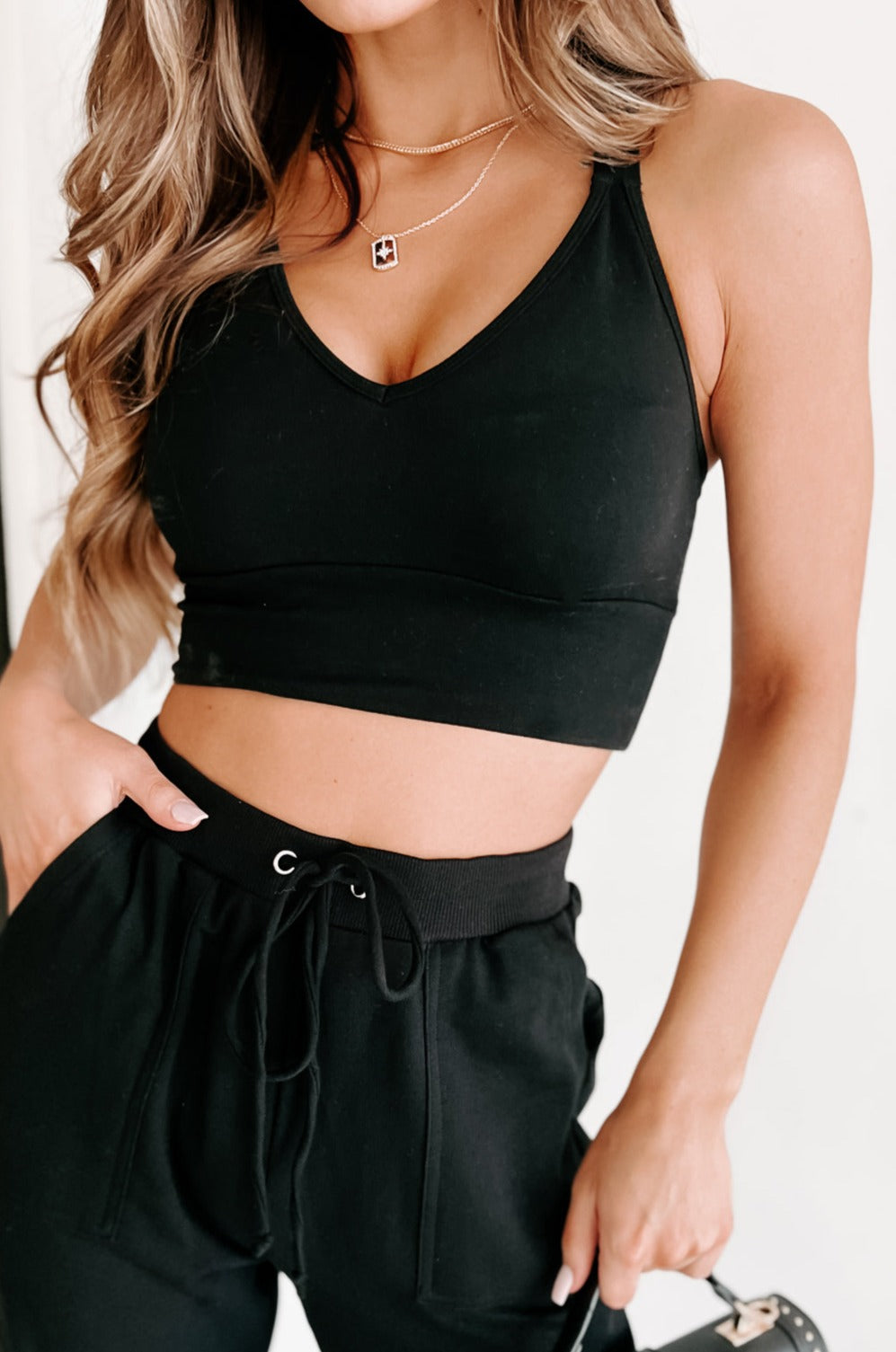 - Top: Cropped Length. Racerback Criss Cross Straps. V-Neck