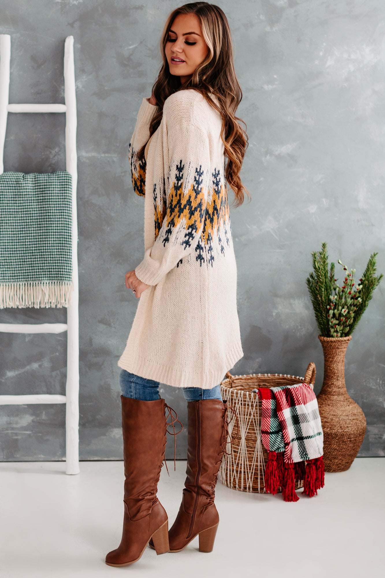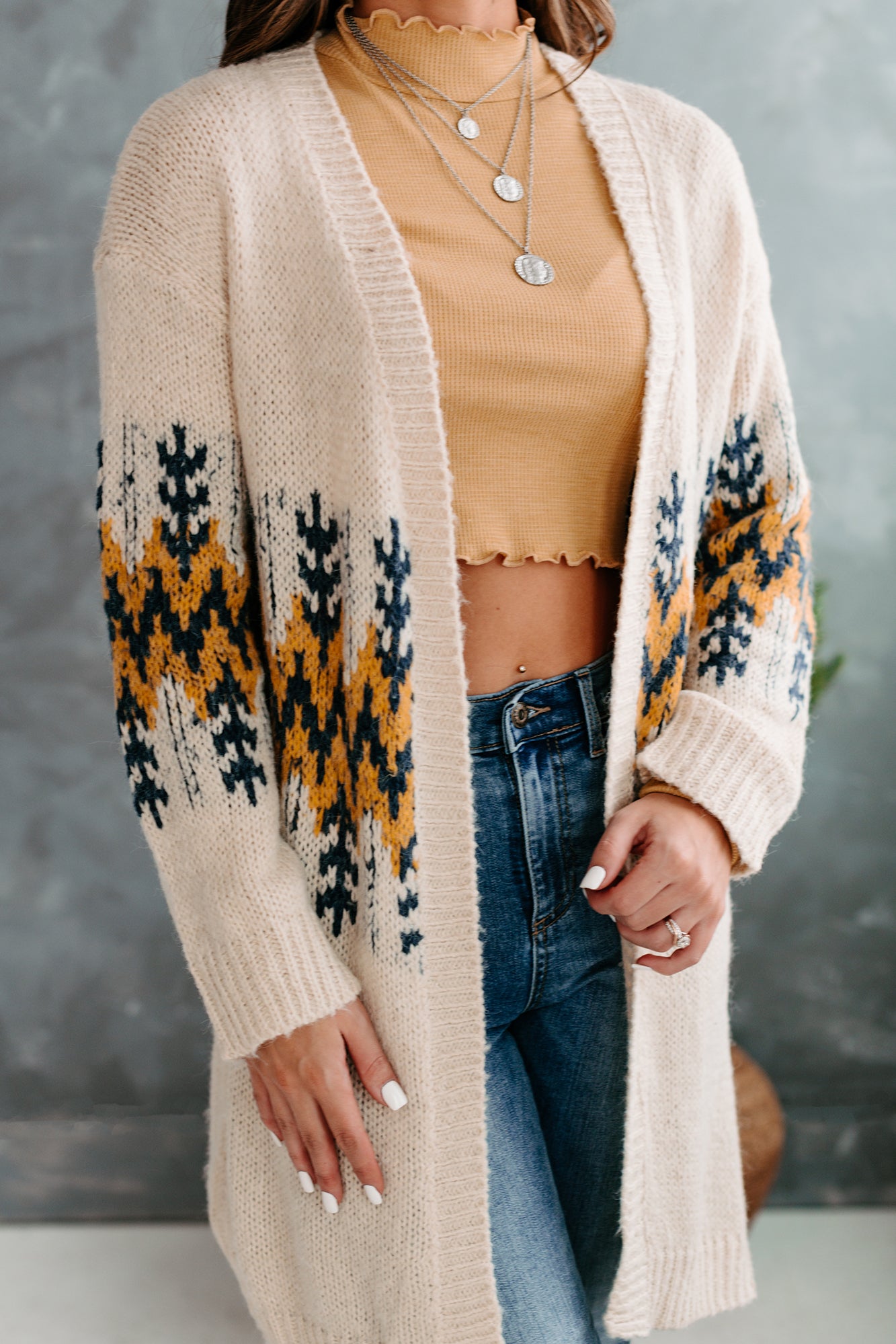 Snag This Ivory & Mustard. Open Front Cardigan! The Mustard & Navy. Knitted Design Will Add Interest To Any Outfit!