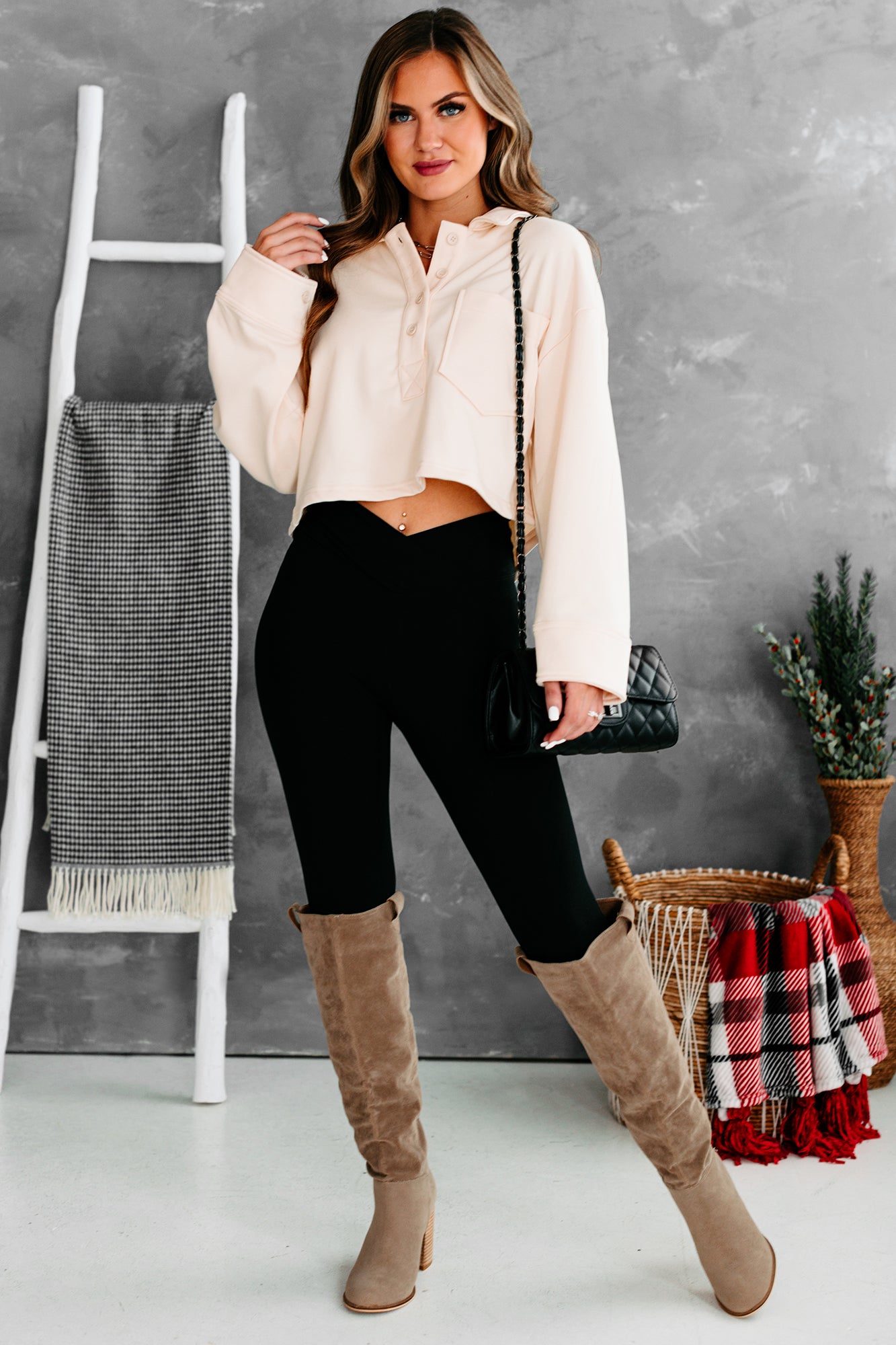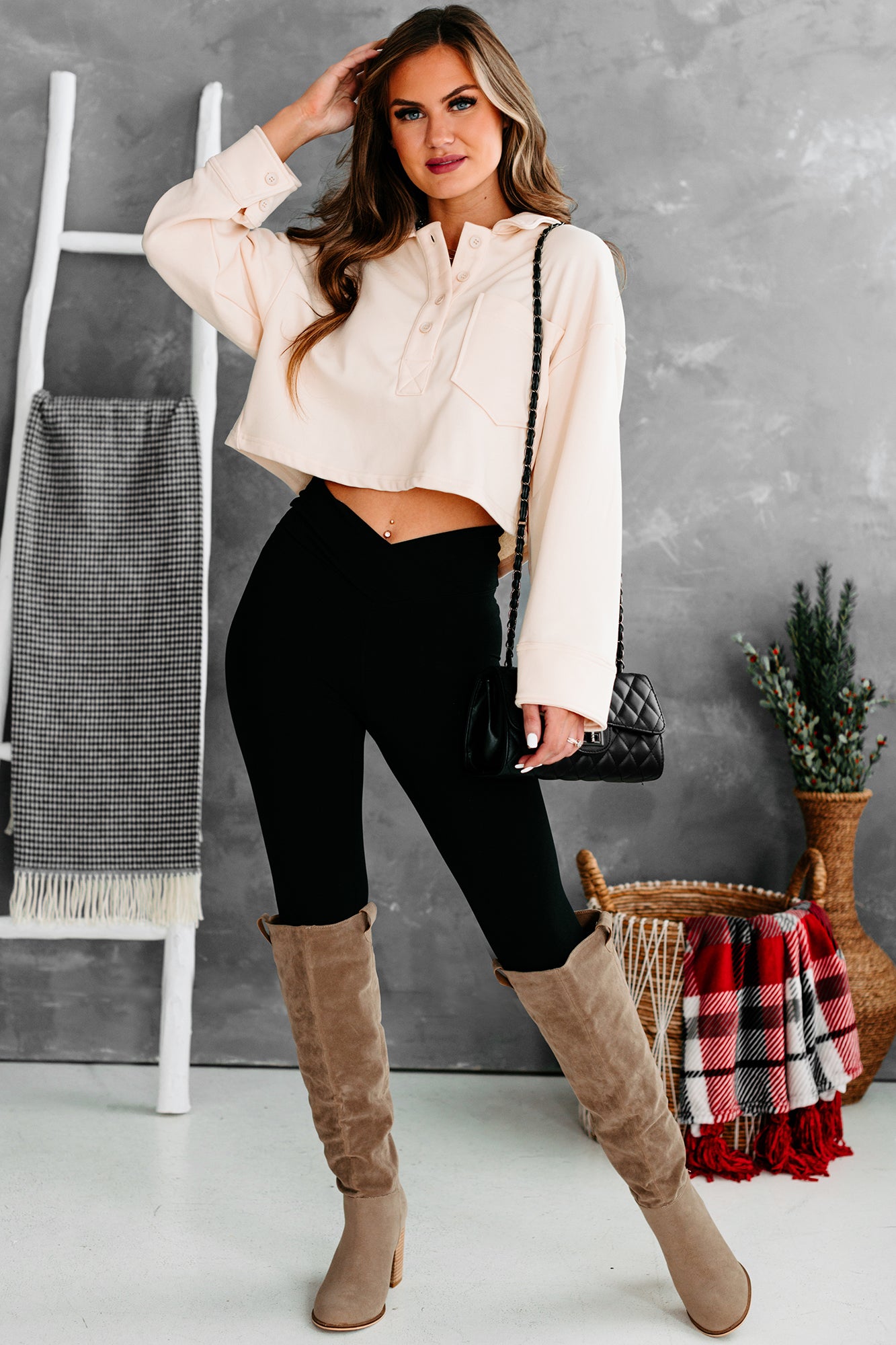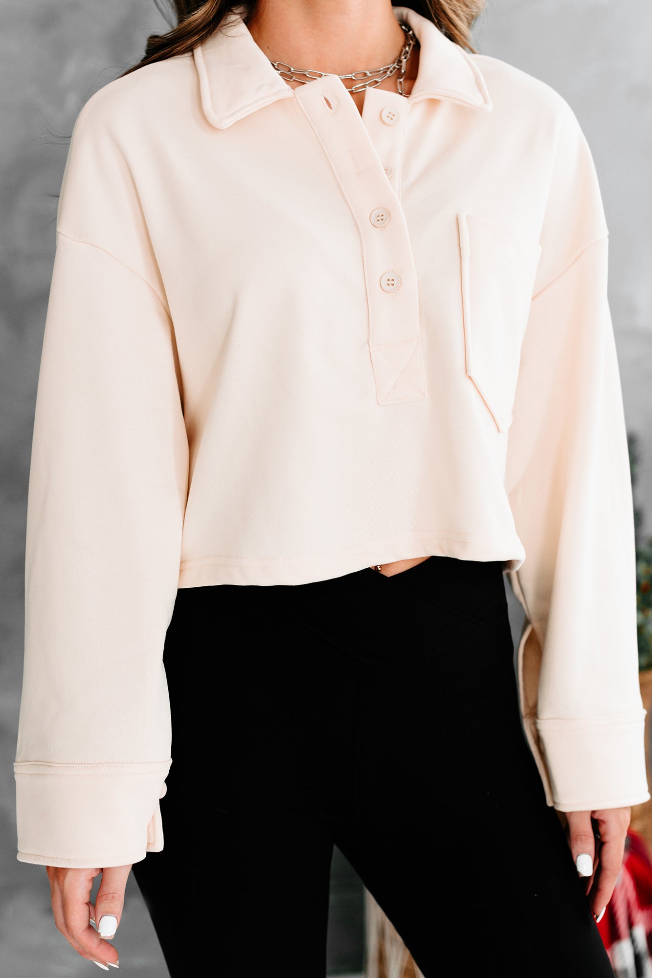 Pair This Beige. French Terry. Collared Crop Top With Your Favorite 90s Denim For A Cute & Trendy Look!