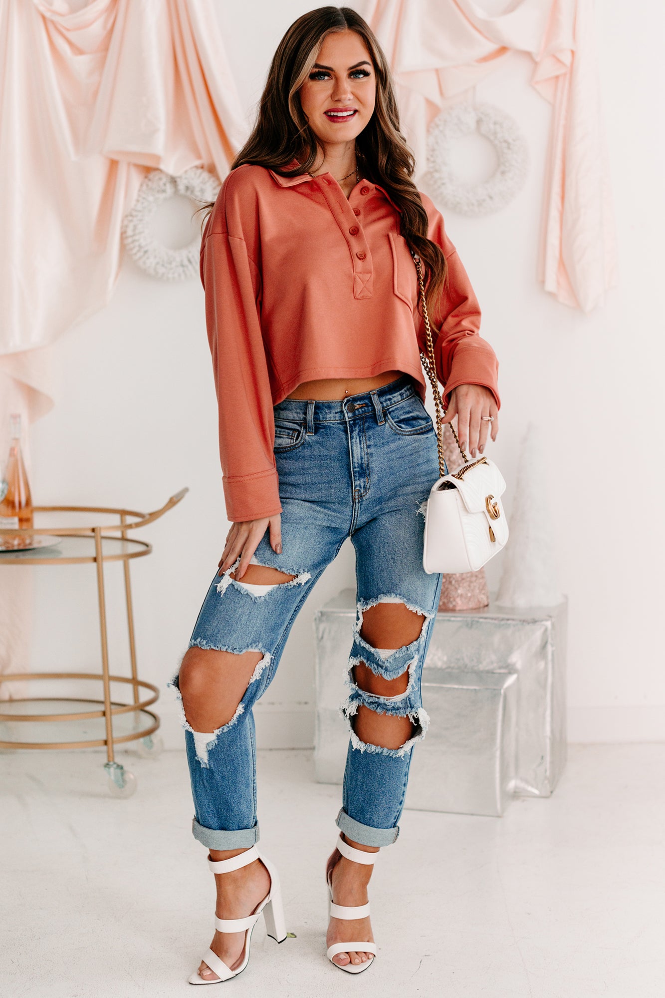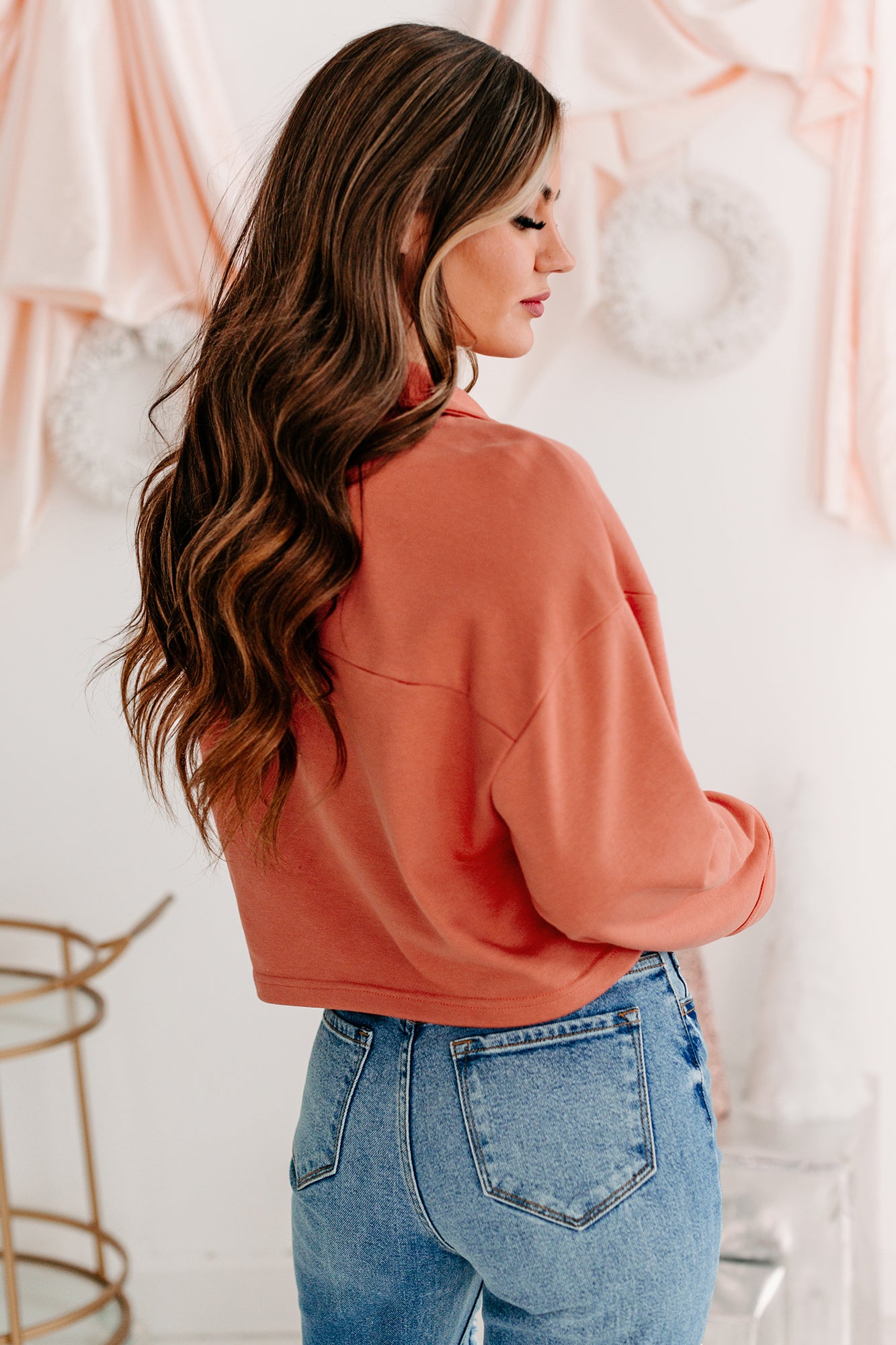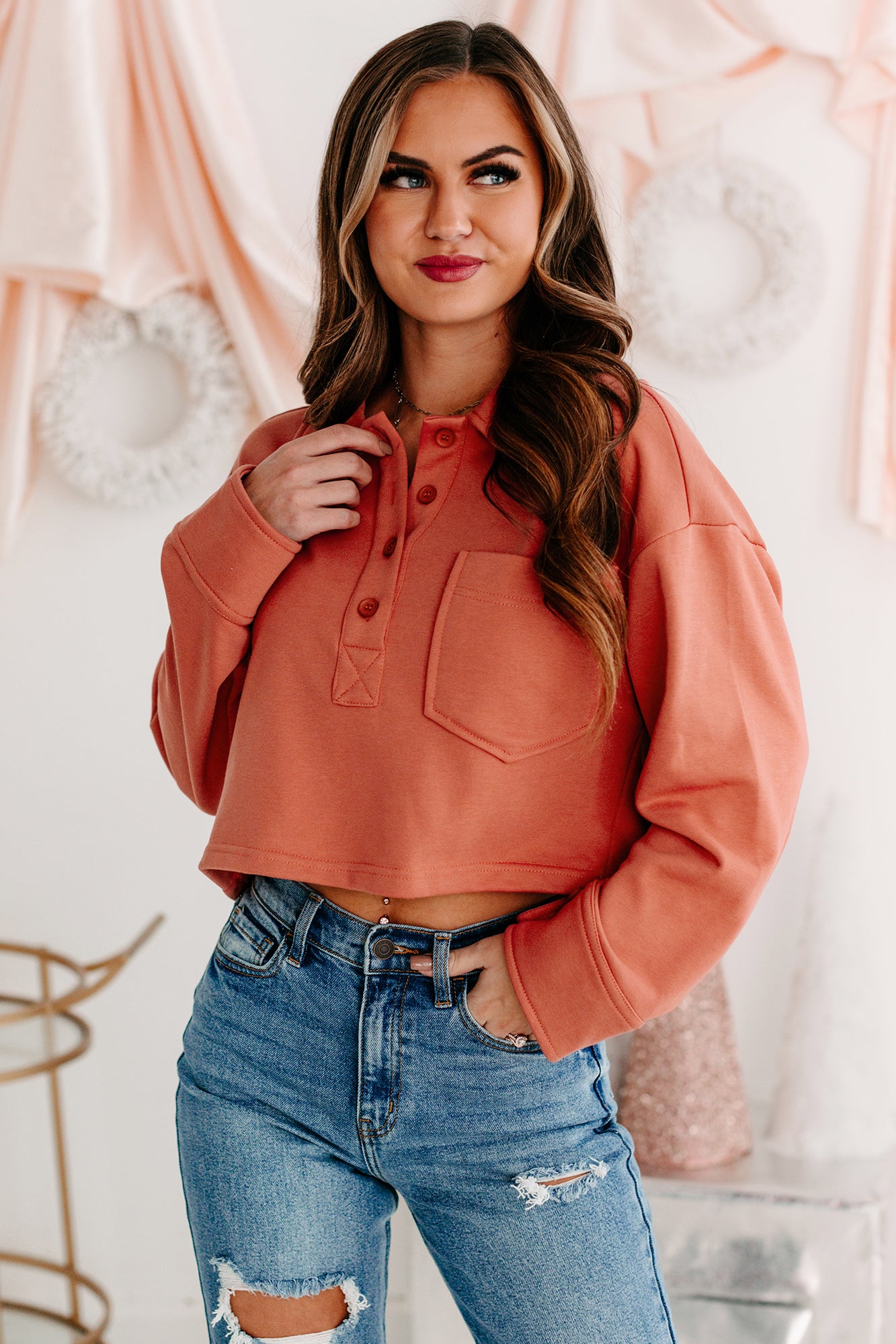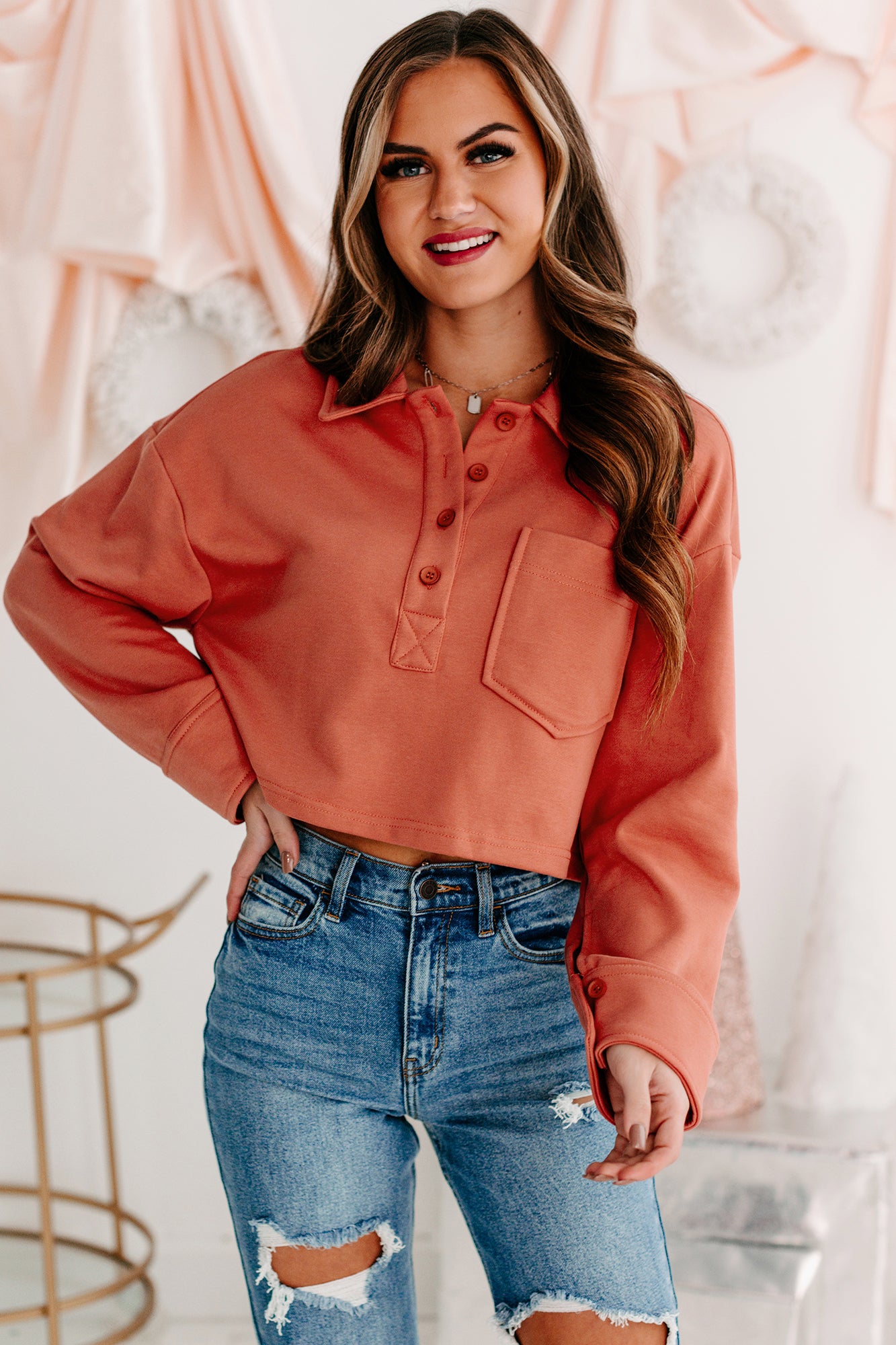 Pair This Brick. French Terry. Collared Crop Top With Your Favorite 90s Denim For A Cute & Trendy Look!