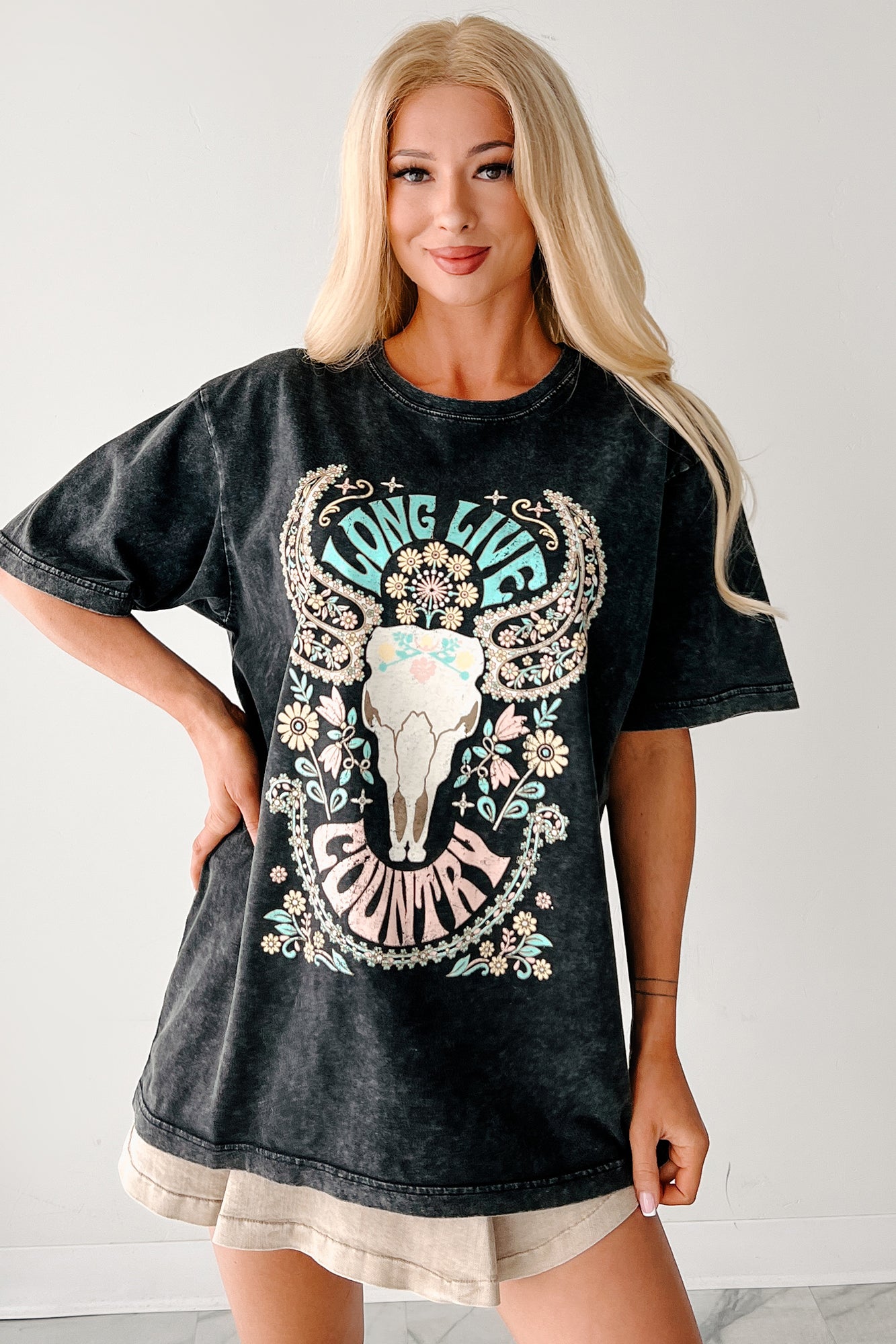 - Graphic: "Long Live Country" Bull Skull & Flowers Print