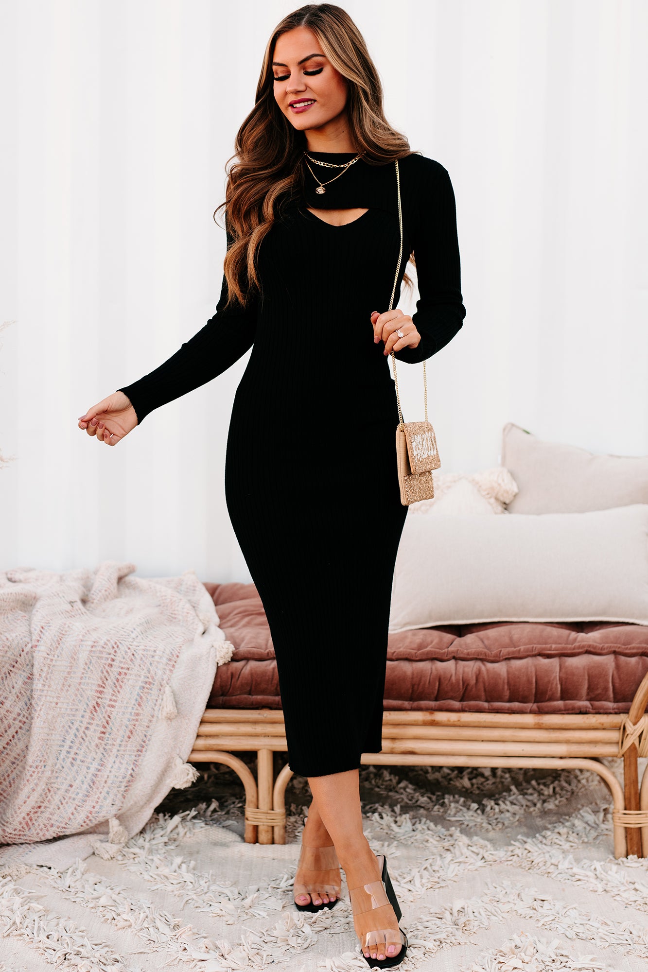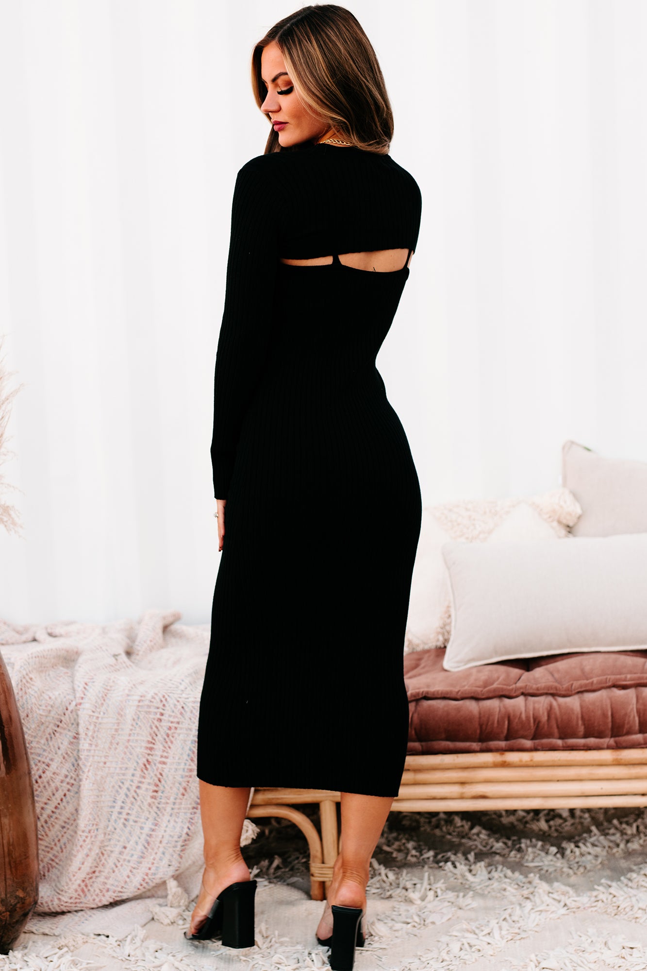 - Dress: Sweater Dress. Spaghetti Straps. V-Neck. Bodycon Fit. Midi Length