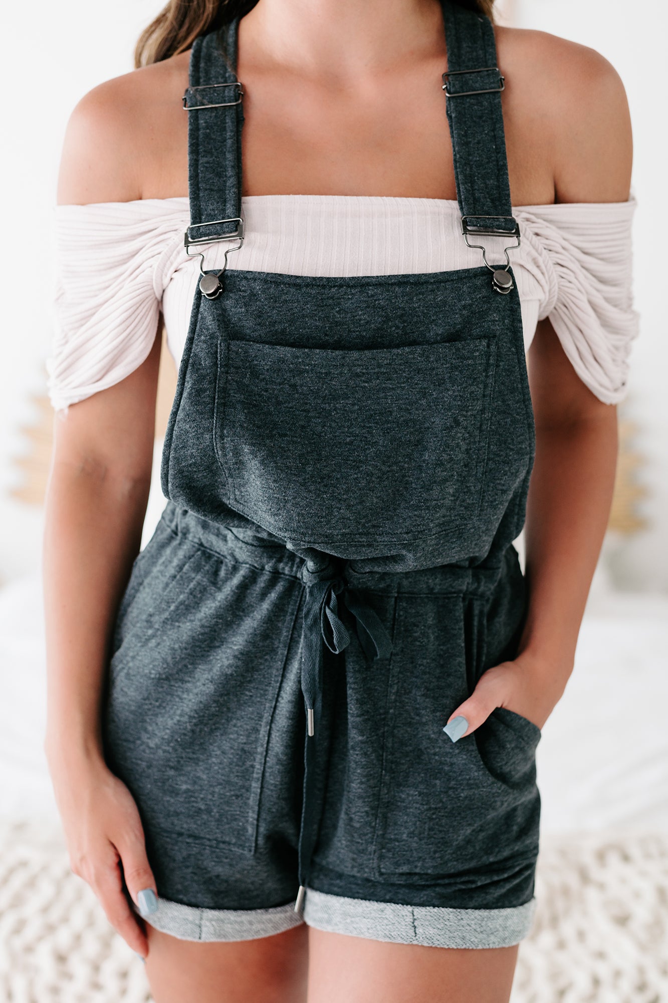 Stay Cute But Be Comfortable In These Charcoal. French Terry Knit. Shorts Overalls!