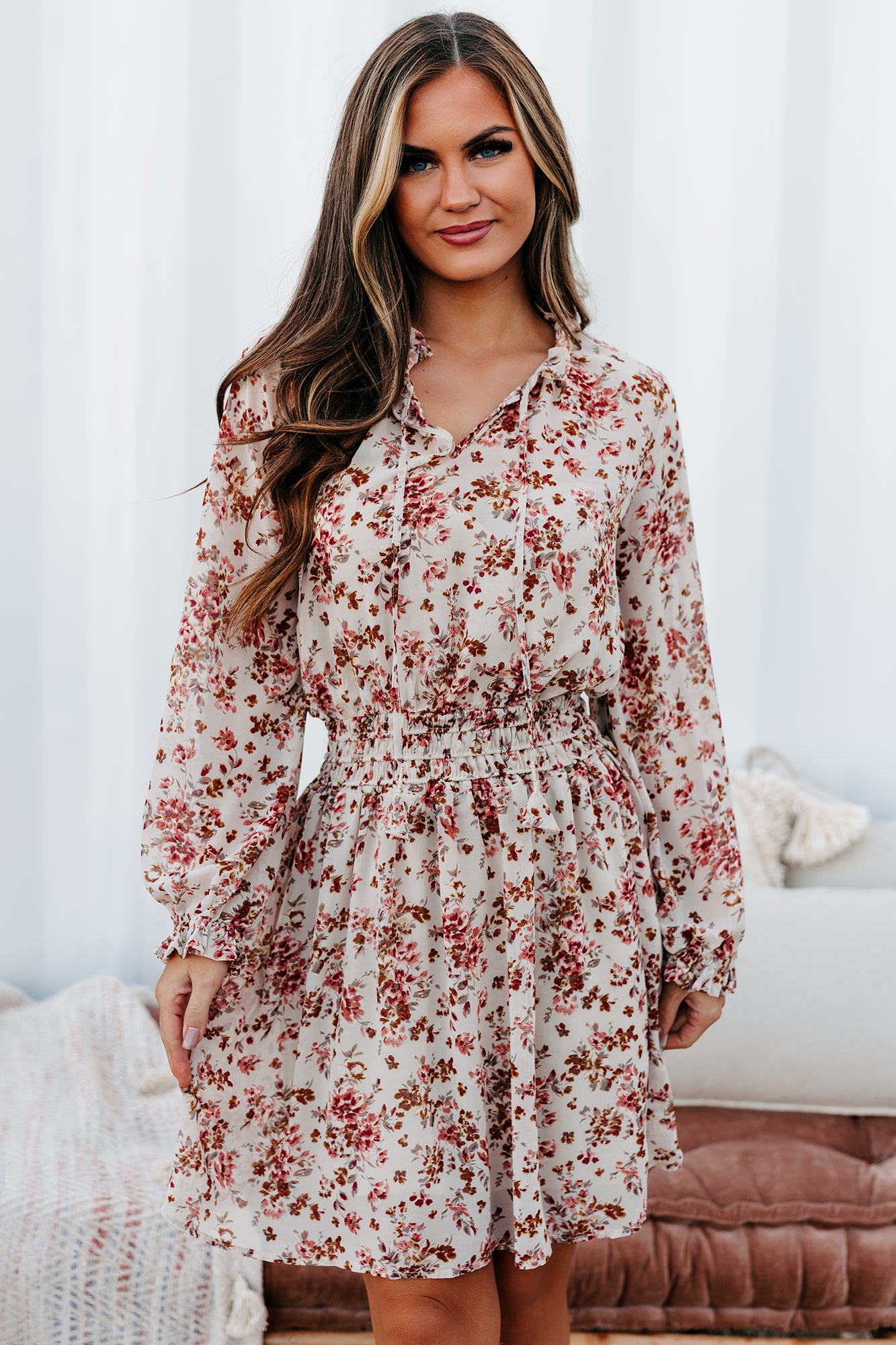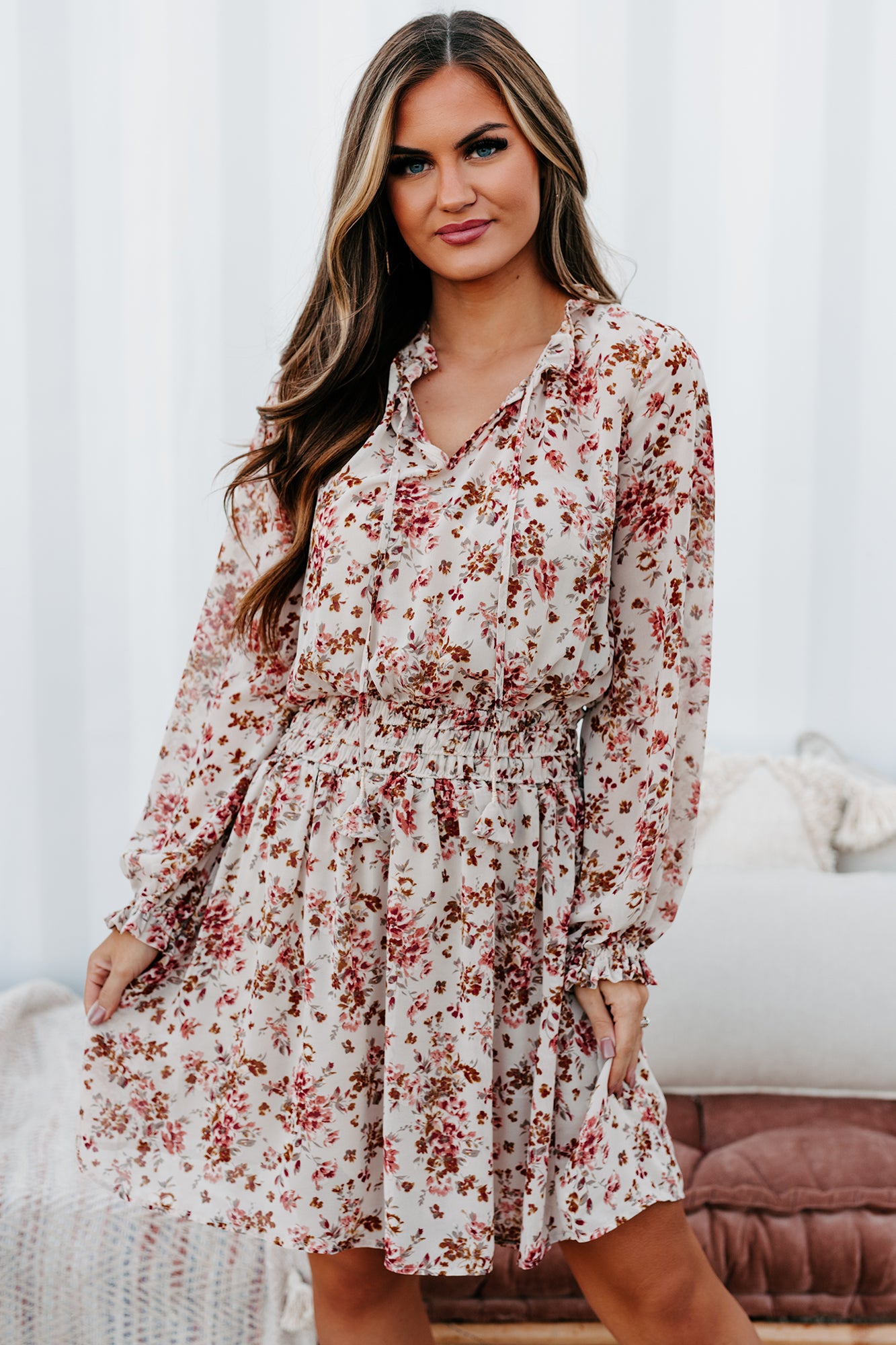 This Tan. Floral Long Sleeve Dress Is Very Boho! Pair With A Hat And Over The Knee Boots For The Ultimate Fall Look!
