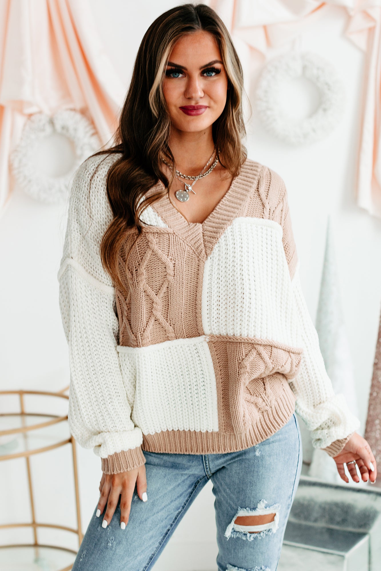 Feel Cute In This Oversized. Cream & Taupe Patchwork Sweater!