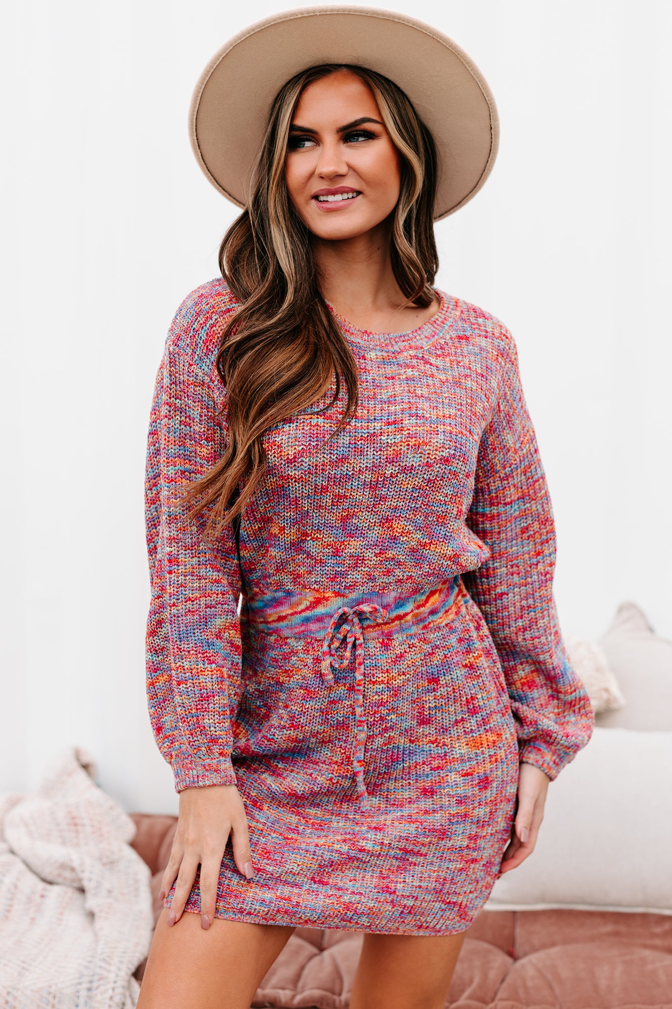 This Rainbow Knit Sweater Dress Will Fulfill Your Need For Color! It Also Has A Drawstring Waist & Balloon Sleeves!