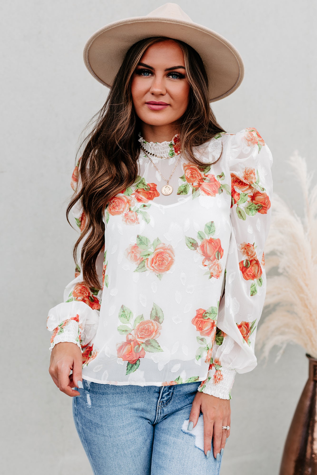 This Off White. Smocked Neck. Puffed Shoulder. Floral Top Is So Chic. You'll Wear It All The Time!