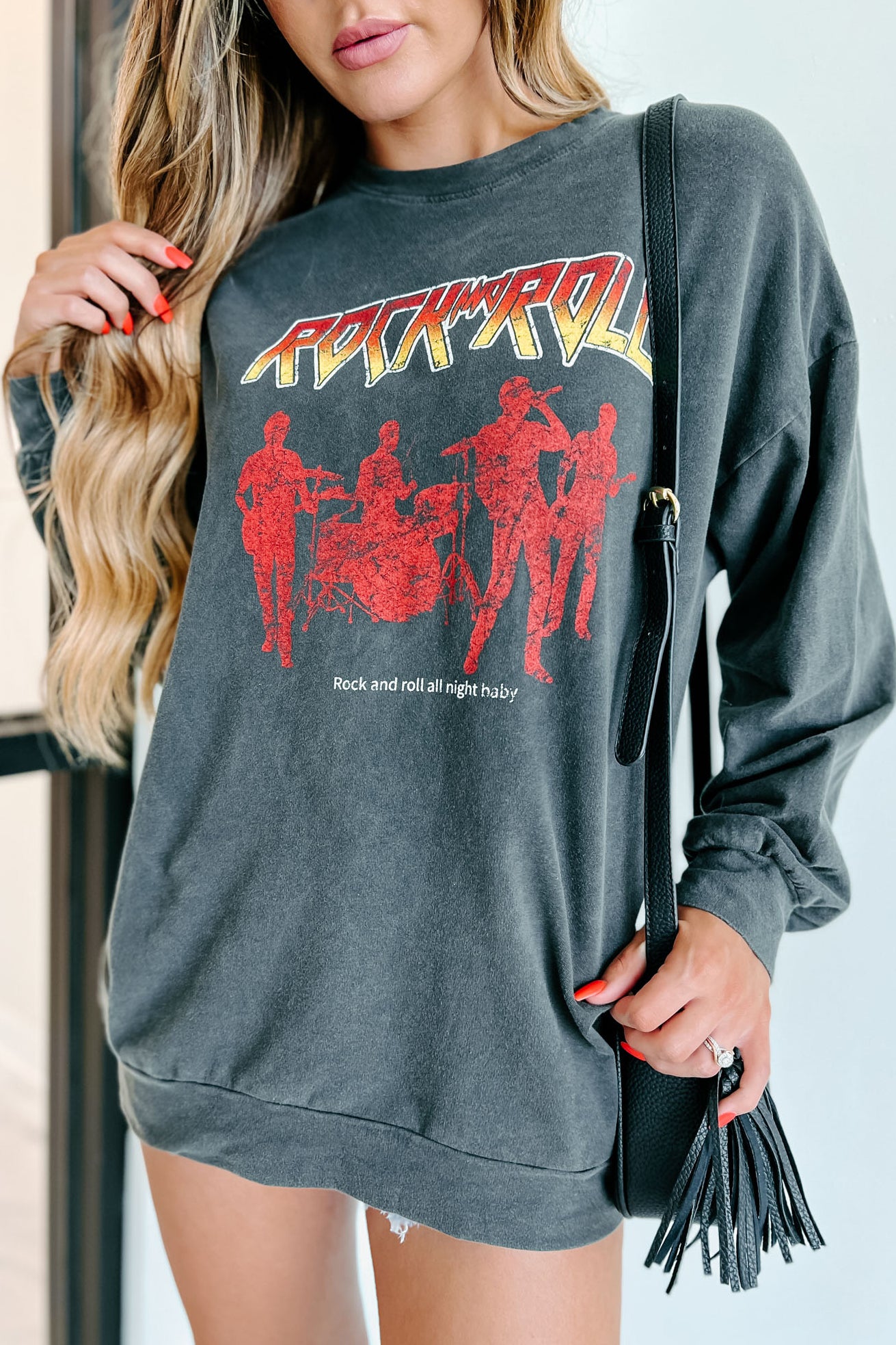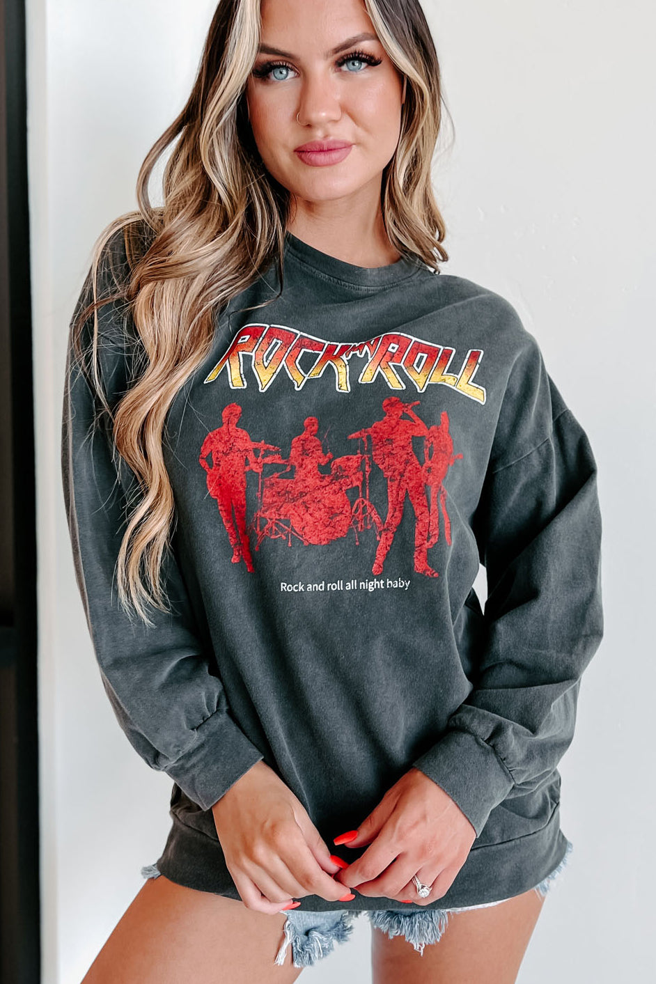 We're All About This Charcoal Grey. "Rock And Roll All Night Baby" Long Sleeve Graphic! It Has That Perfect. Worn-In Feel!